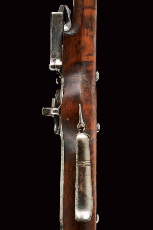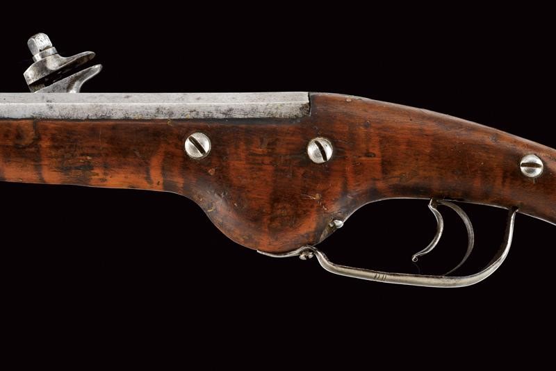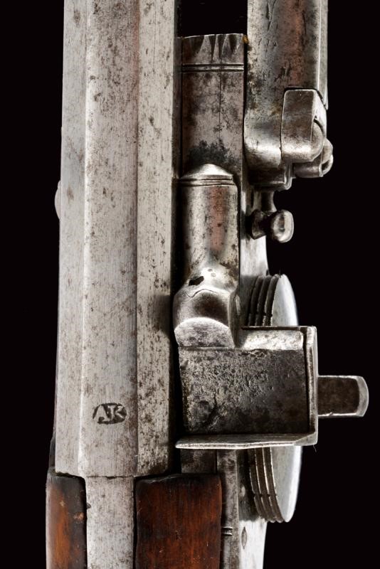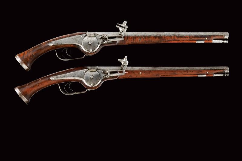 Smoothbore, octagonal barrels, one marked "AK" at breech, 14 mm cal at the nozzle,. Wheel-locks with thick lock plate with oblique borders, pan covers with working snap system. Outer wheels held by a small screw head. Smooth wooden full stocks (both with