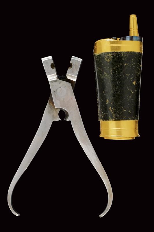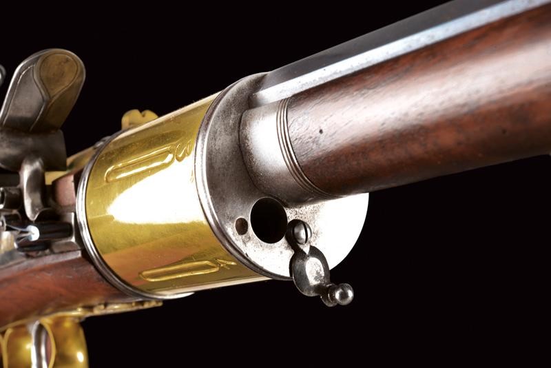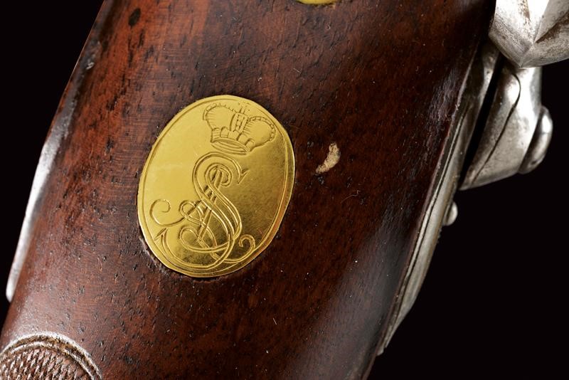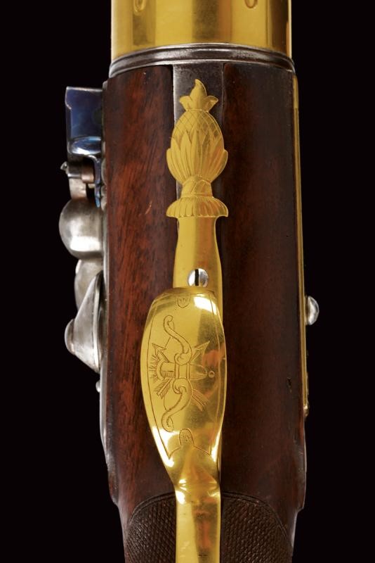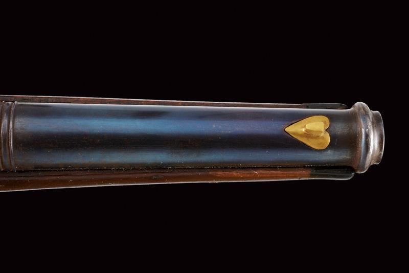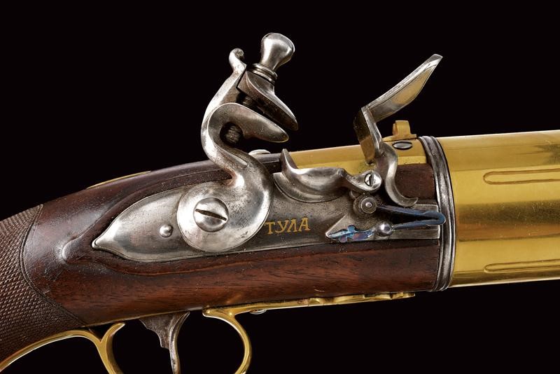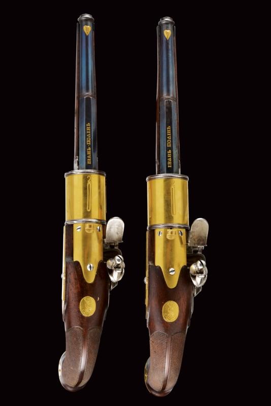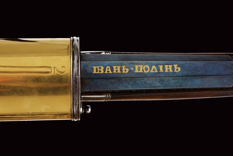 Smoothbore, browned, two-stage, 10 mm cal. barrels, first octagonal with signature "IVAN POLIN" (in Cyrillic) in gold; the round segments with gilded foresights and nozzle with moulded muzzle. Five-shot, gilt brass cylinders with iron disc-shaped ends; on