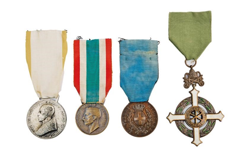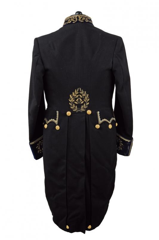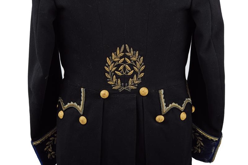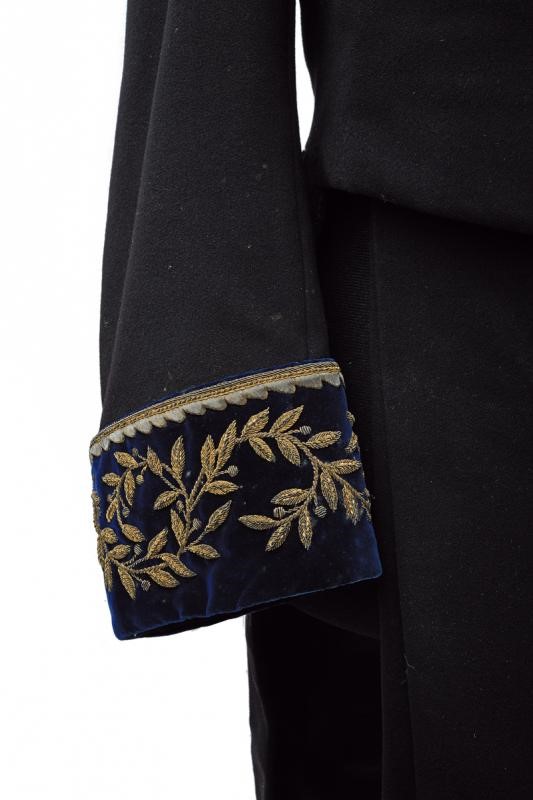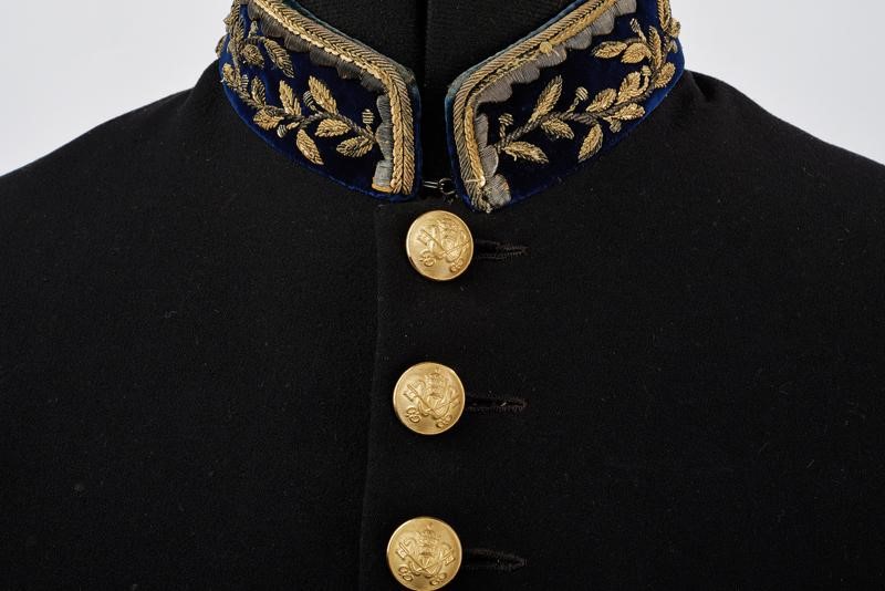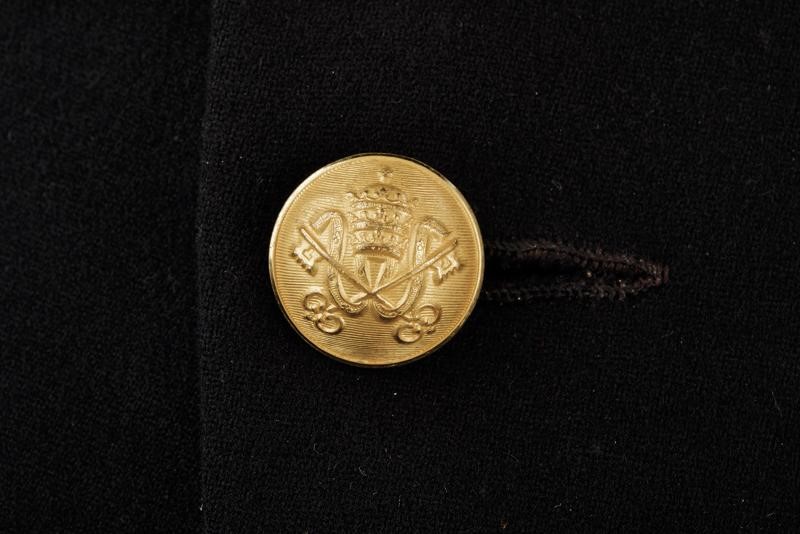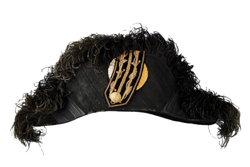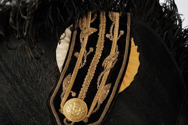 Black beaver-skin bicorn with marbled bands, black-coloured plumage, golden button with embossed papal frieze holding the black velvet stripe embroidered with golden-thread laurel fronds, the cockade made of two-coloured fabric; silk band and cap inside.