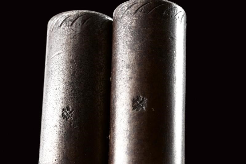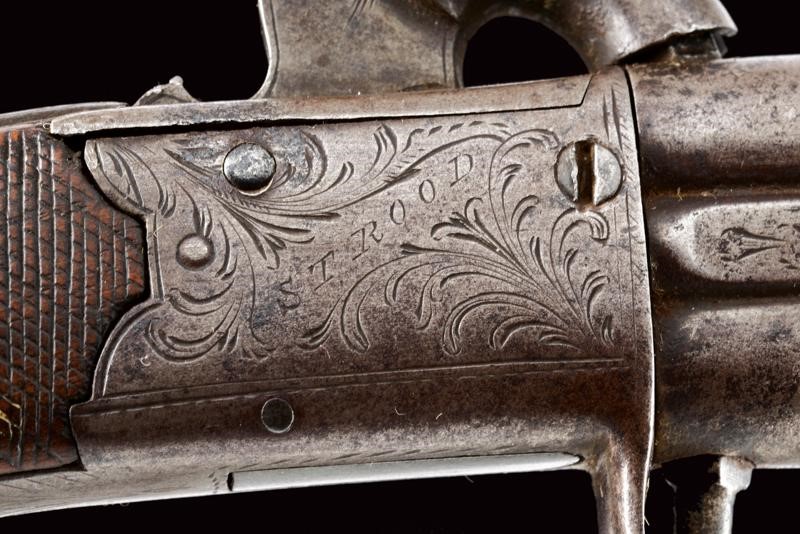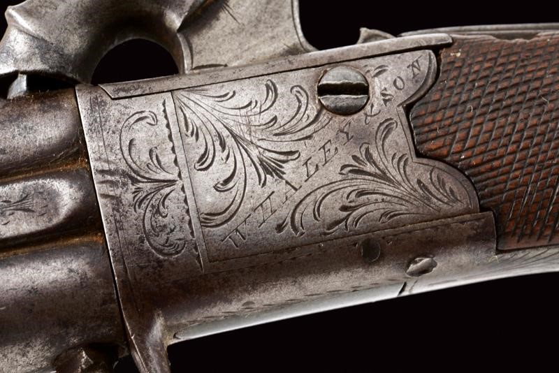 Round, smoothbore, turn-off, 9 mm cal barrels, engraved at the nozzles, with marks of the test bench; frame signed "WHALEY & SON" and "STROOD" among floral motifs. Upper hammer with secure-lock, foldaway trigger. Checkered wooden stock with silver badge o