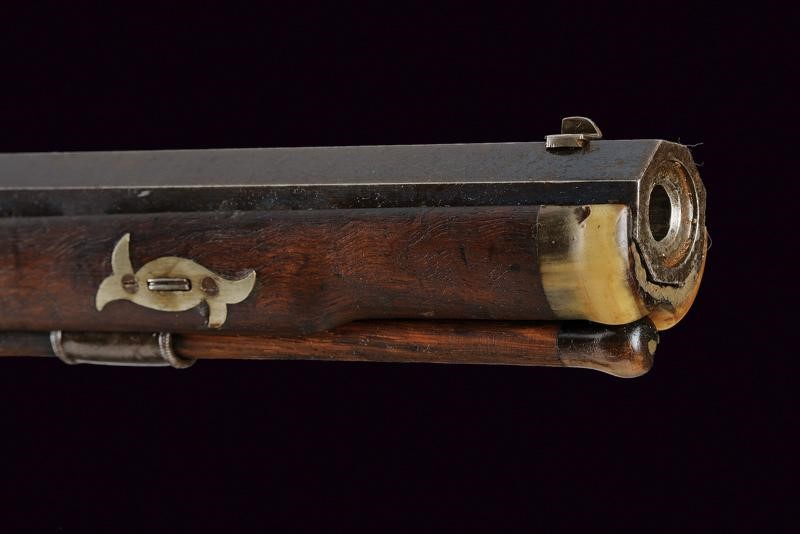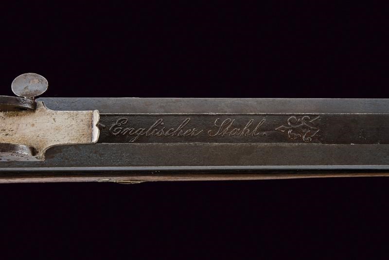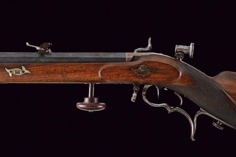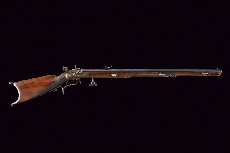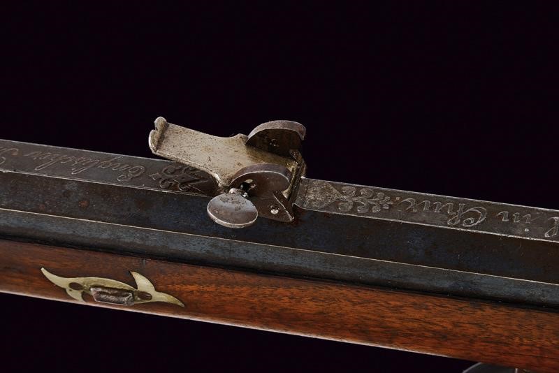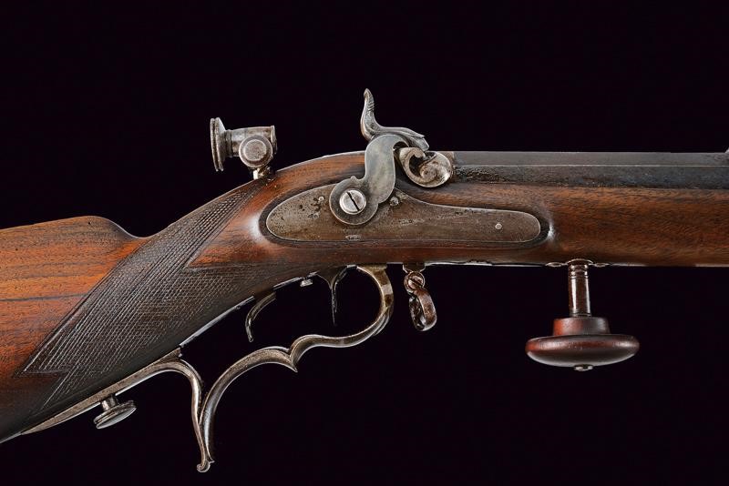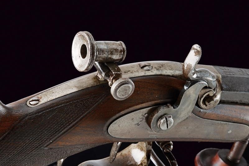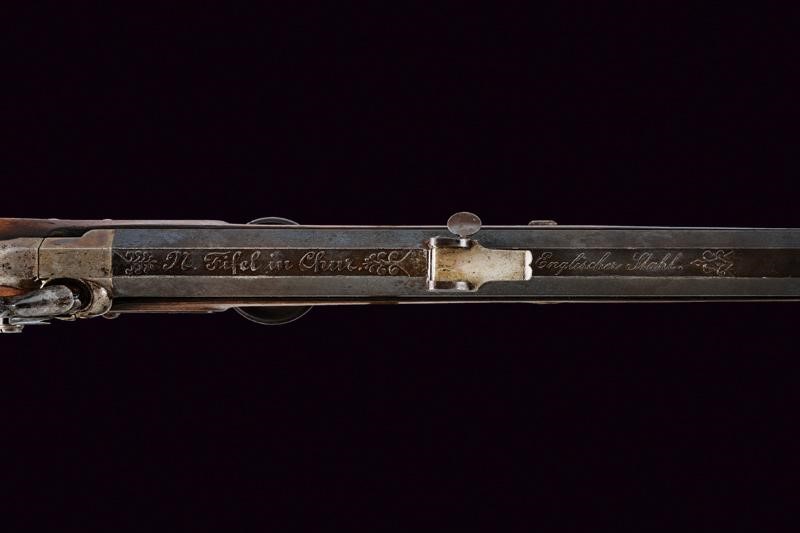 Heavy, octagonal, rifled, 10.4 mm cal. barrel. Signed "Tifel in Chur." in relief at the back and with mark "Englischer Stahl" in relief. Adjustable rear sight. Tang with peep sight. Forward spring lock, working mechanism. Wooden full stock with cow-horn m