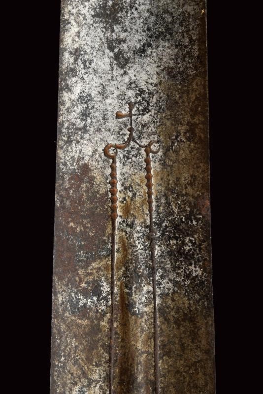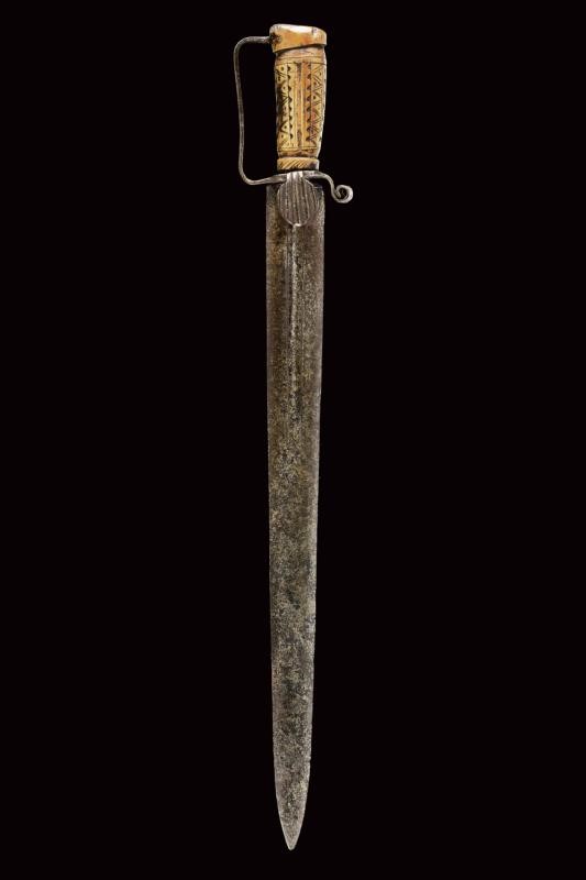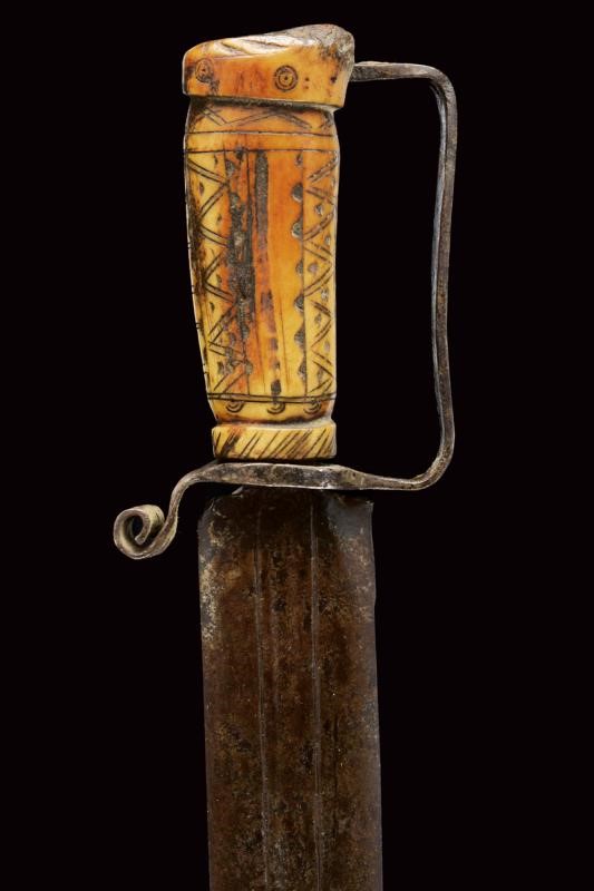 Wide, straight blade of lenticular section, slight central fuller outlined at the borders at the first part. Iron hilt with valve parallel with the blade and carved as a shell, quillon shaped as a curl, loop guard. Deer horn grip richly engraved with geom