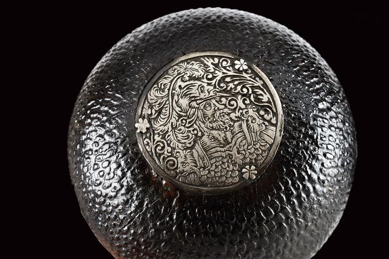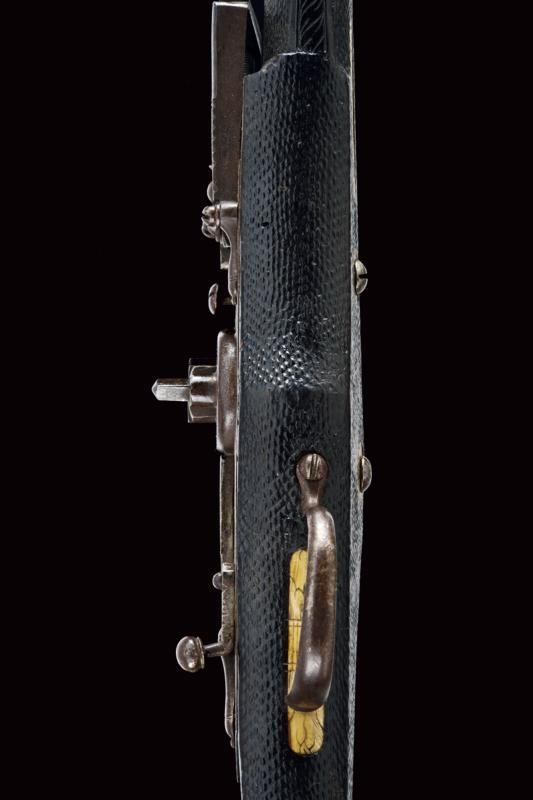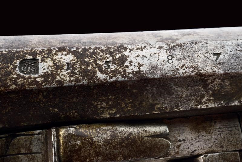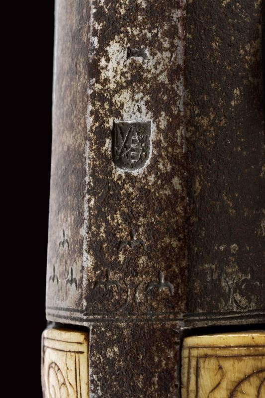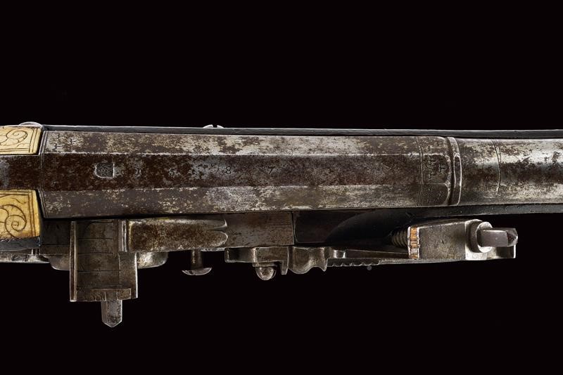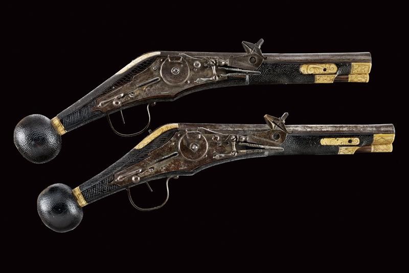 Smoothbore, two-stage, 16 mm cal. barrels, with a faceted ring at the girdle, the first part is octagonal with a Saxon mark, the date ì1587î and engraved ends, then round at the second part; engraved, curved tangs; external wheel locks with a trigger slid