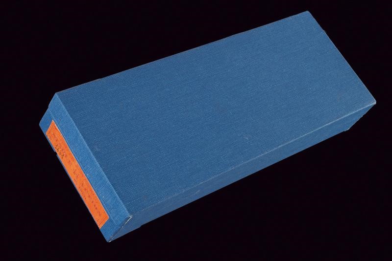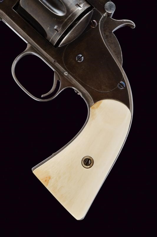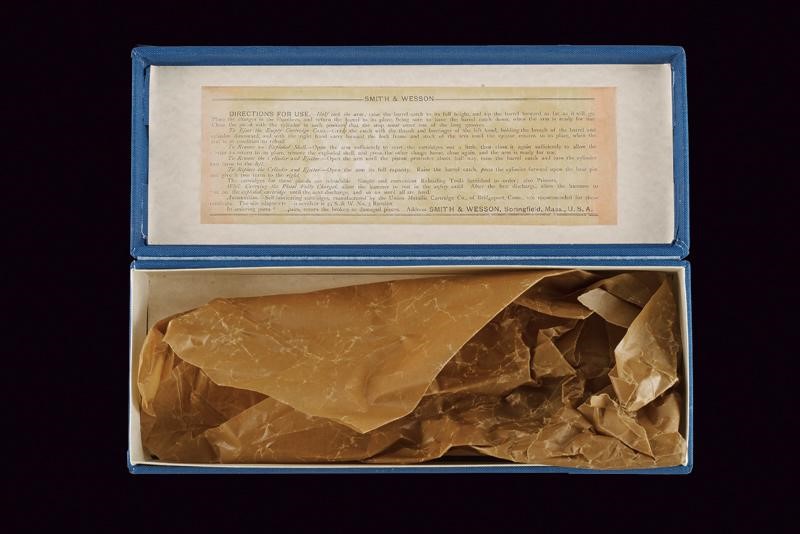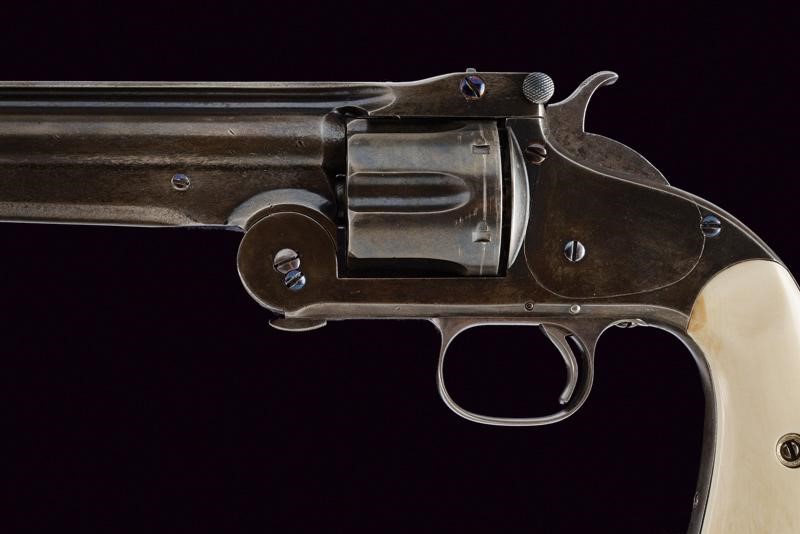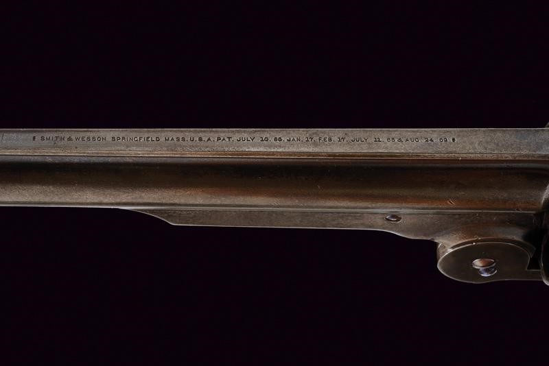Round, rifled, 8" barrel (clean bore, visible rifling), provided with back rib, foresight, and mark of the company with patents up to 1869, between crosses. 44 S&W American caliber. Six-shot cylinder. Serial number "16xx" under the grip. Marked with "V3"