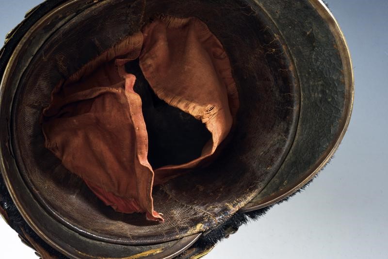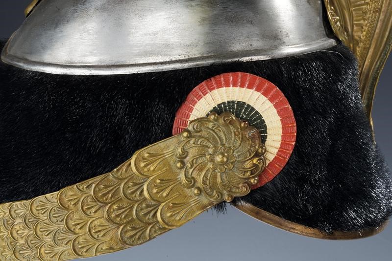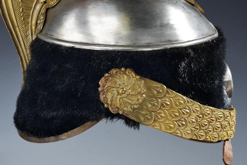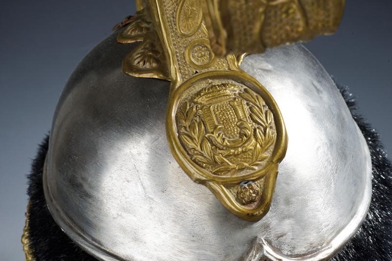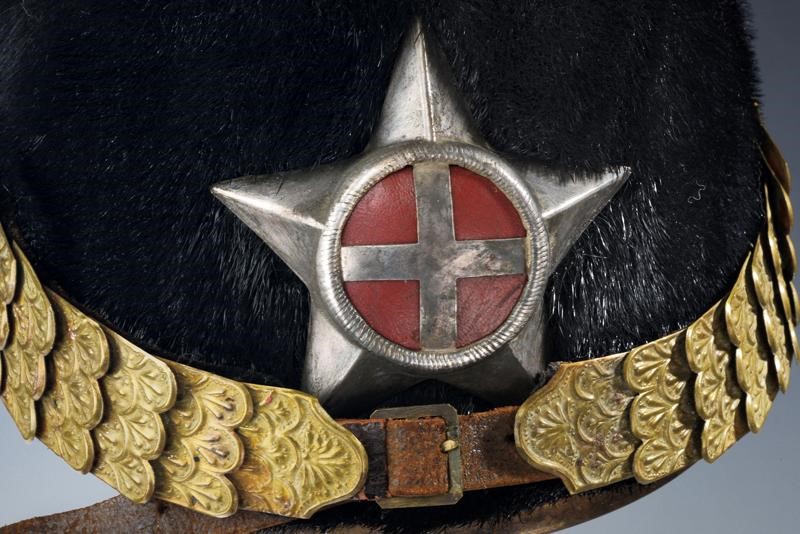 Iron skull with fur band (Phoca vitulina) featuring a metal front ornament with a silver star surmounted by a Savoy cross on a red background; plume-holder with gilded brass crest featuring a lion's head in bas-relief and an ornament at the base with a cr