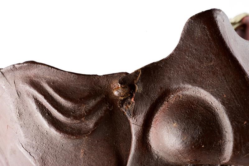 Of Me no shita men type. Iron structure, with expression wrinkles and strongly protruding chin. Rough, russet sabinuri lacquer with a few cracks. Removable nose (damaged open-work , it tends to slip off) lacquered en suite, with missing mustachios. Open m