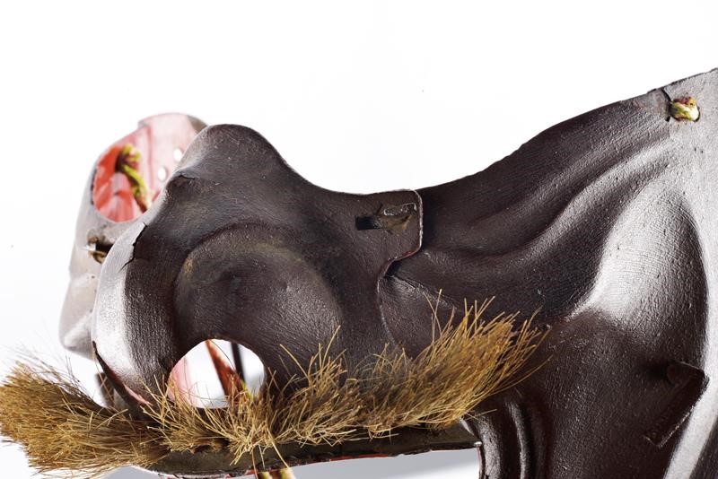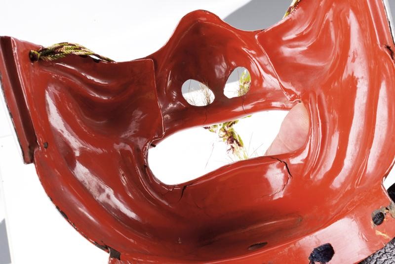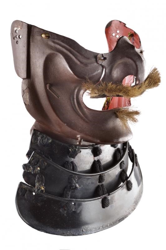 Of Me no shita men type. Iron frame, with well-marked expression wrinkles and strongly accentuated cheekbones. Russet lacquer outside with a few cracks and small missing parts. Removable nose with dilated nostrils lacquered en suite. Open mouth without te
