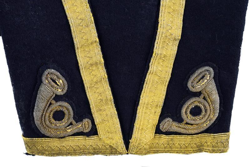 Made of black fabric, richly decorated with chevrons and gilded threads. Tails with hunting horns. Shoulders with loop. Complete with buttons decorated with crowned coat-of-arms of the Borghese family in bas-relief. The upper part lined with linen, the lo