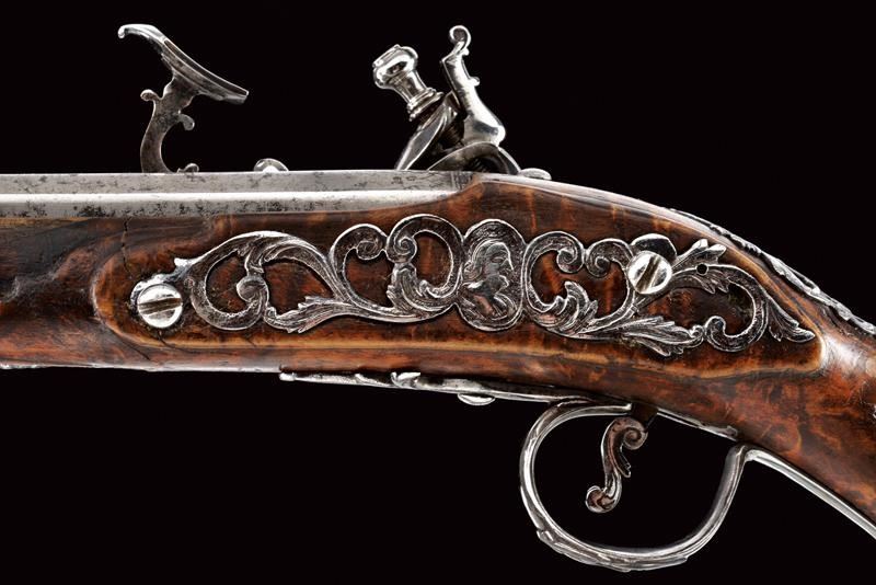 Smoothbore, two-stage, 10 mm cal barrel, octagonal at the first part and with engraving at the base, then round, after a ring, and with moulded nozzle; engraved tang; snaphaunce lock with beautiful carvings and engravings, sliding pan cover signed "Il G-p