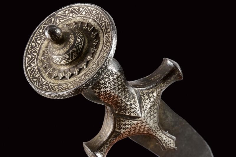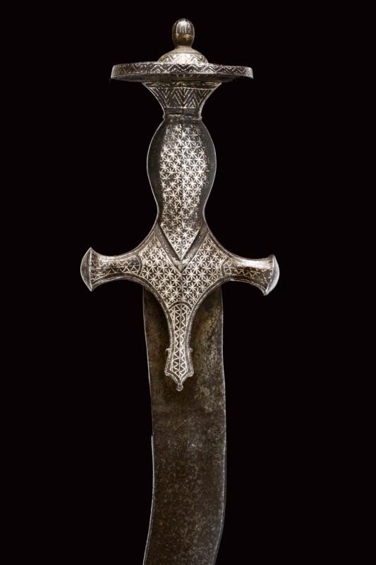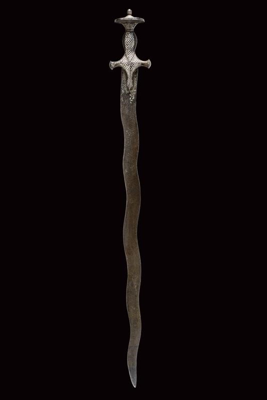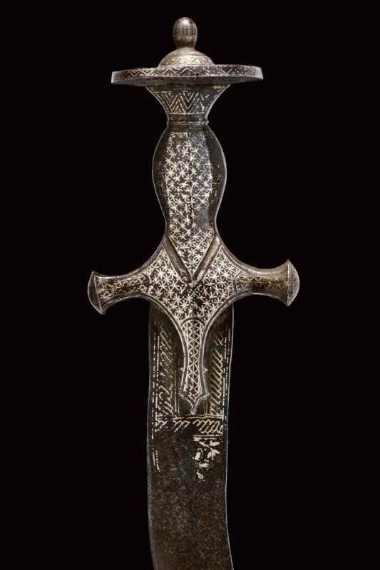 Wide, single-edged, waved blade, the base on one side with remains of silver decoration with floral and geometric motifs. Typical iron hilt decorated en suite.