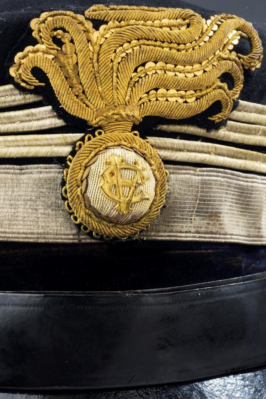 Black cloth with red outlining and all parts of uniform. With leather sweat-band and black silk cap inside. Together with two white metal stars for the collar, two gala shoulder boards and a sabre sword knot.