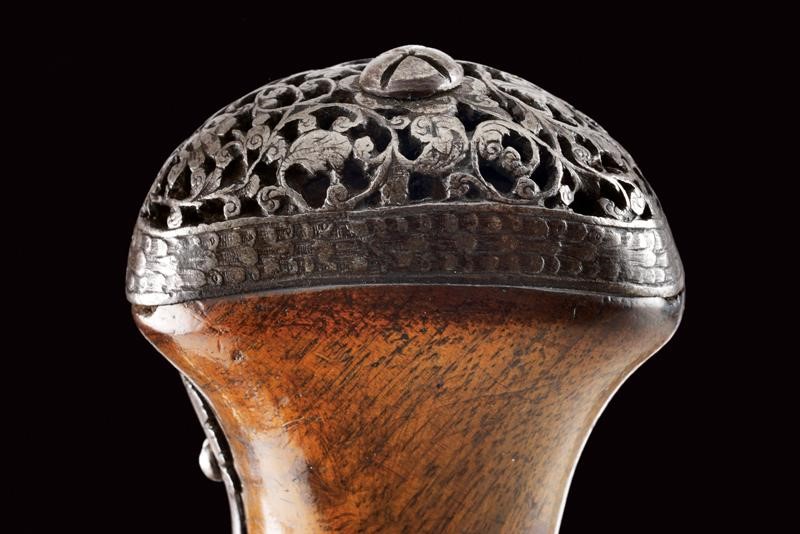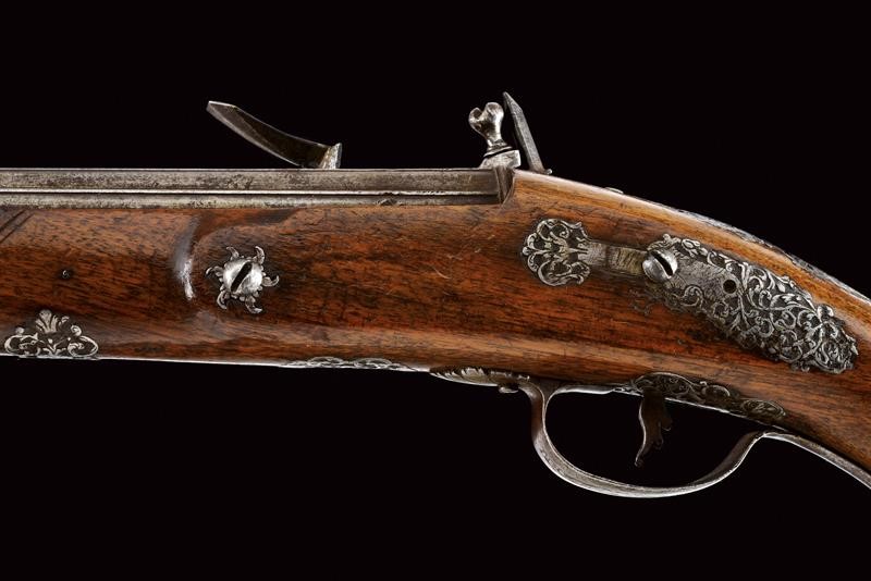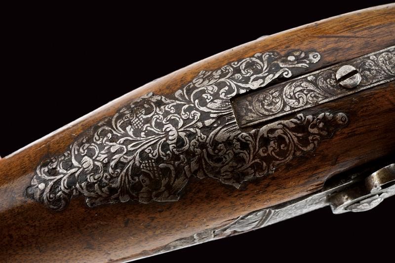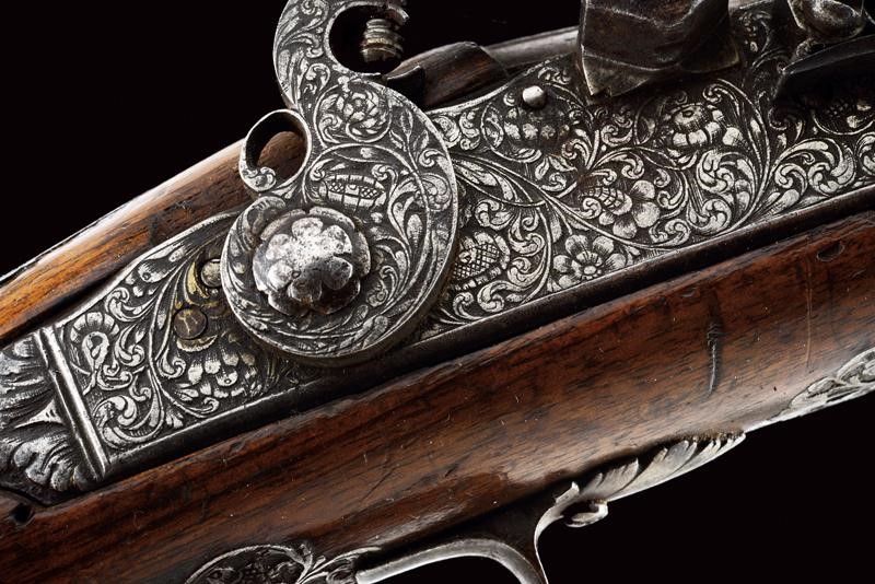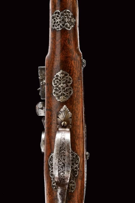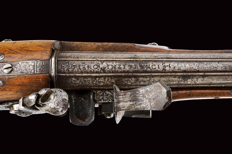 Smoothbore, two-stage, octagonal and round barrel; the breech with molded frame, with longitudinal ribs at the corners in the first segment, rings at the girdle, the second segment faceted, 14.2 mm cal nozzle. Signed "PIERO INZI FRANCI" on the back among