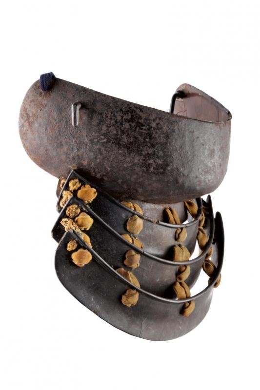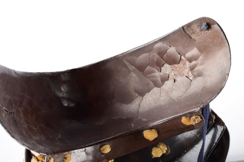 With iron structure consisting of two plates fixed with rivets, visible in the lower part of the chin the central plate. Russet outside. Orikugi. The inside with brown lacquer (various cracks and missing parts). Iron, brown lacquered, three-plate Yodare-k