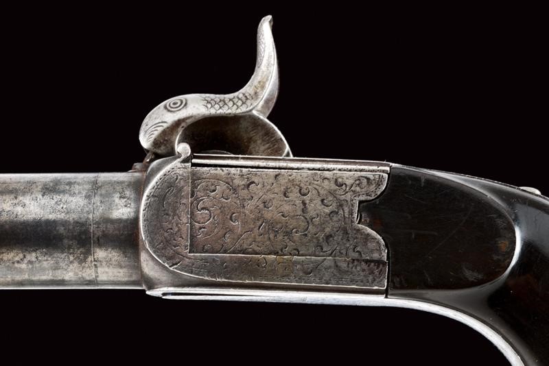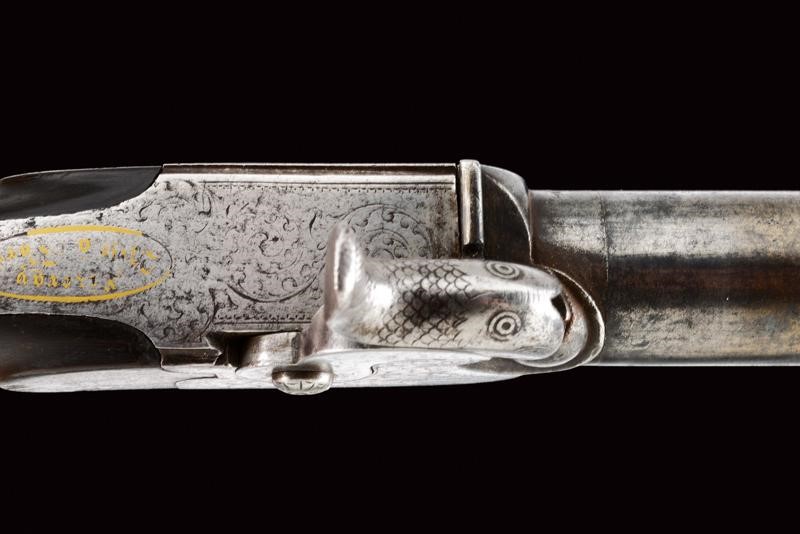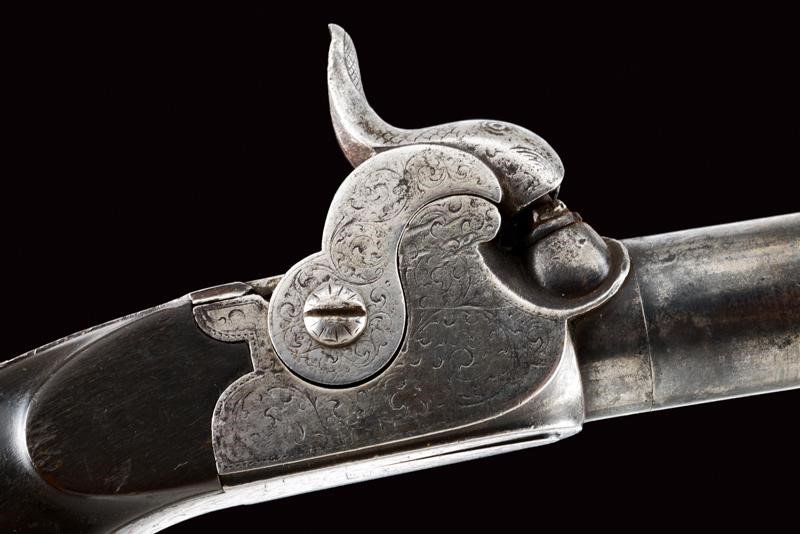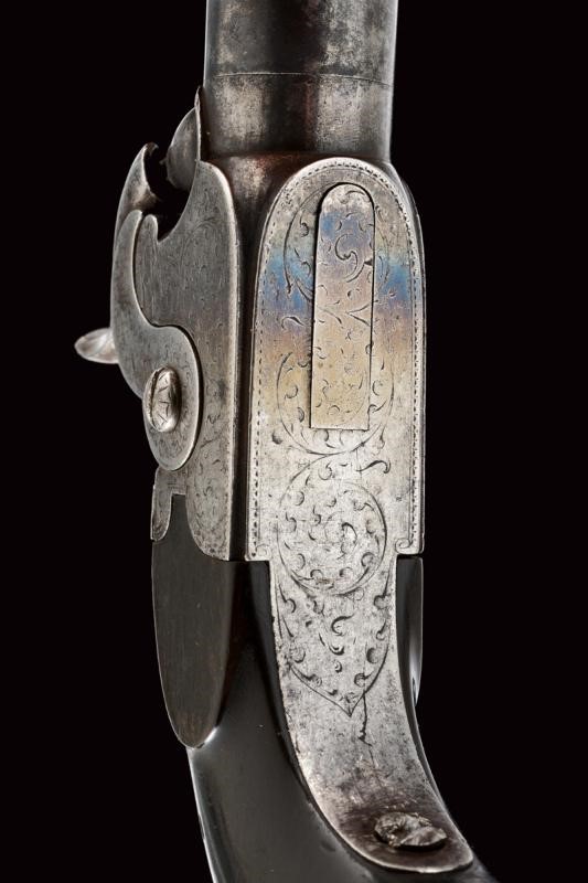 Smoothbore, round, turn-off, 14 mm cal. barrel; frame engraved with floral motifs with cock integrated at the same level, the tang with not clearly legible signature and gold- inlaid "Lizeray Bole ‡ Paris". Foldaway trigger. Wooden butt with iron drum dec
