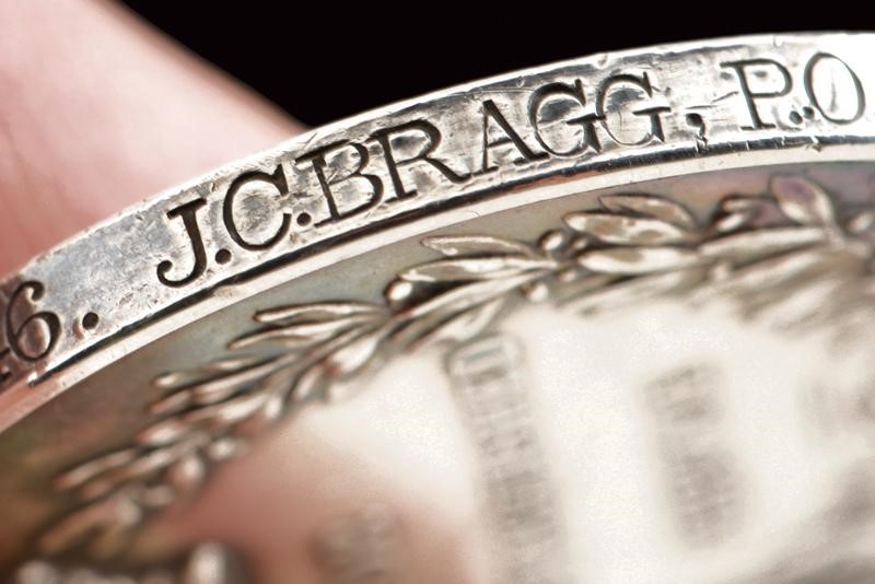 Made of silver. George V, without crown (1914-30). Marked "193246 . J.C.BRAGG, P.O.H.M.S. ORION 31 MAY, - 1. JUNE, 1916" on the border. On ribbon.