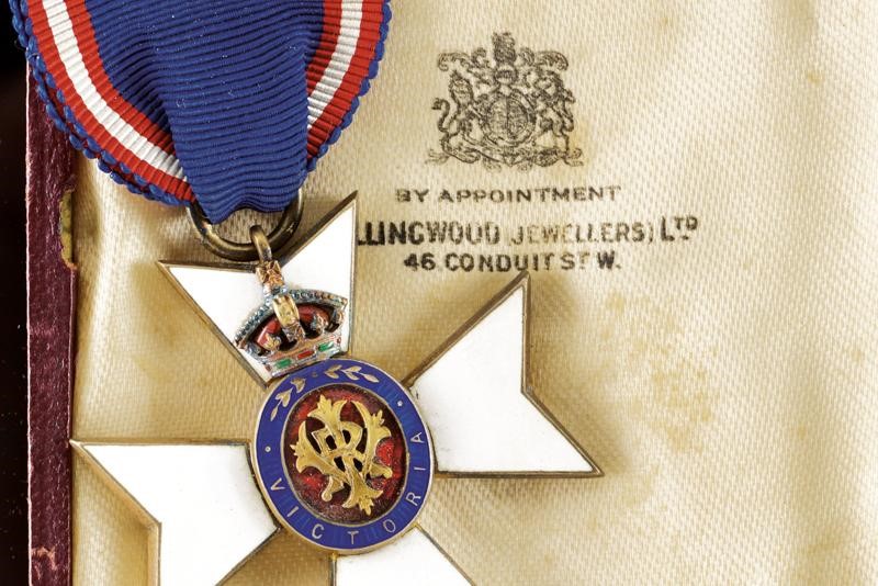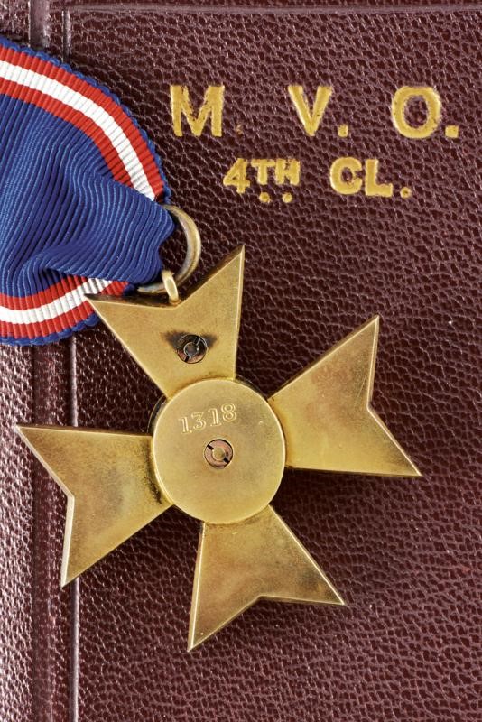 Knight's cross (M.V.O 4th CL), made of gilded and enameled metal. Back number '1318'. On band. In original case with gold designation.