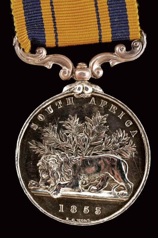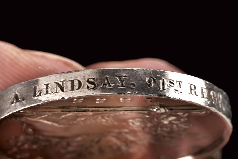 Made of silver with date 1853, marked "A. LINDSAY, 91ST REG.T" on the border. On ribbon.