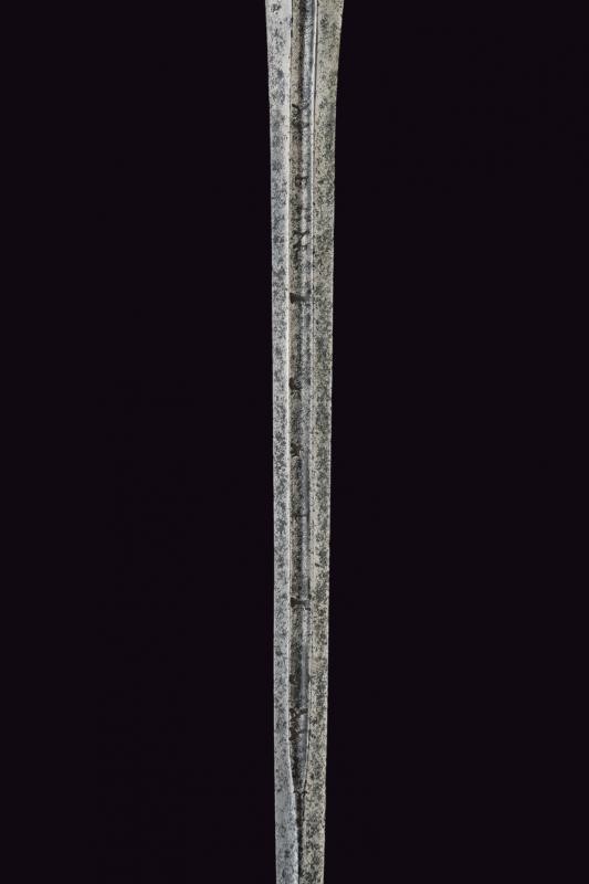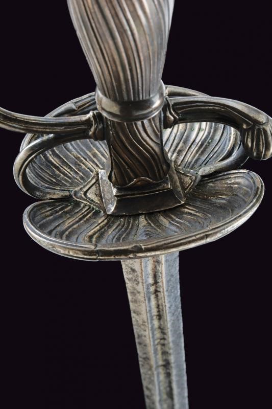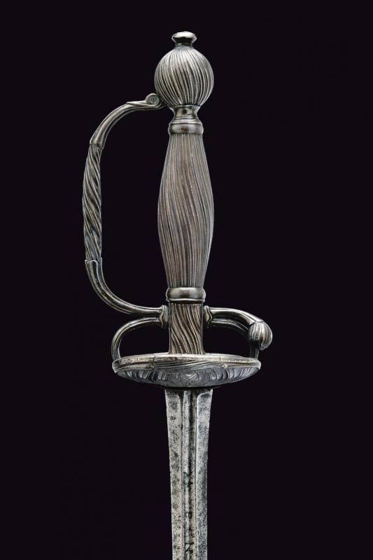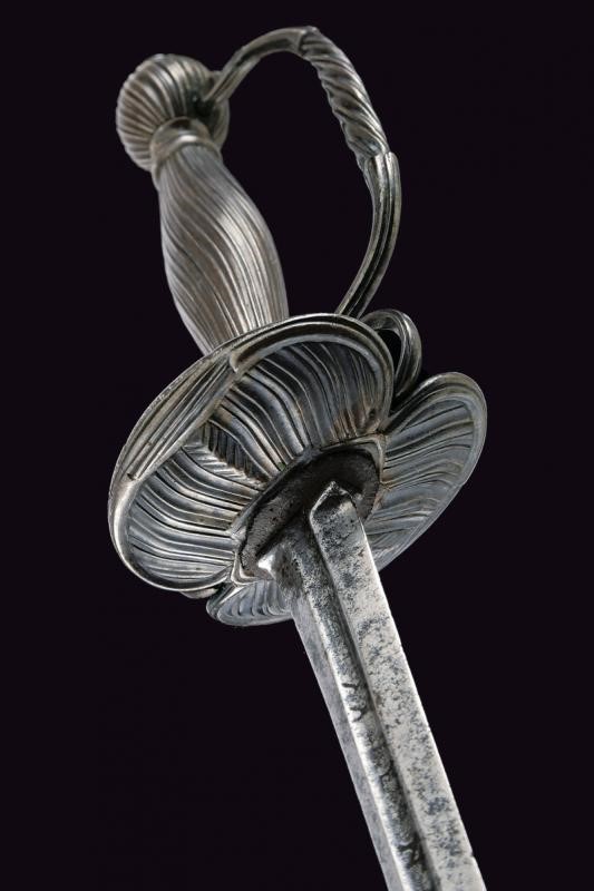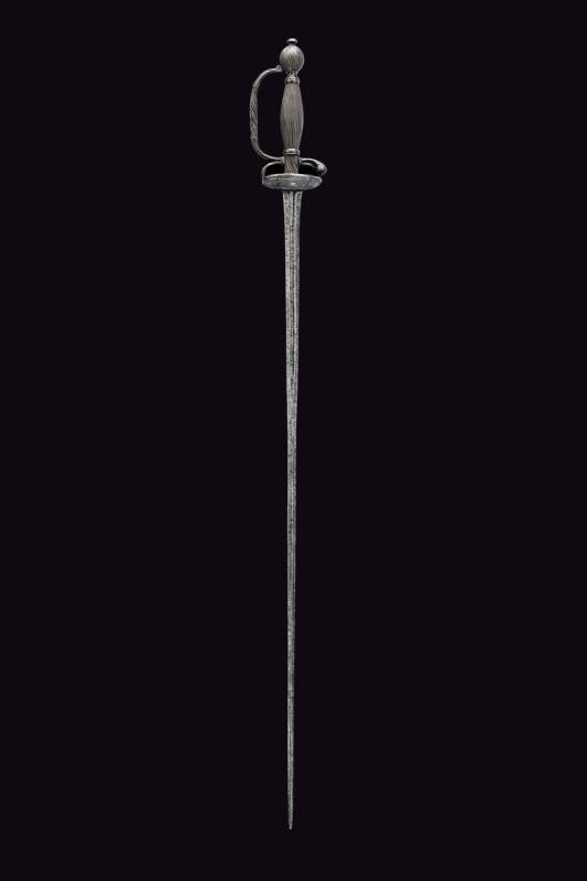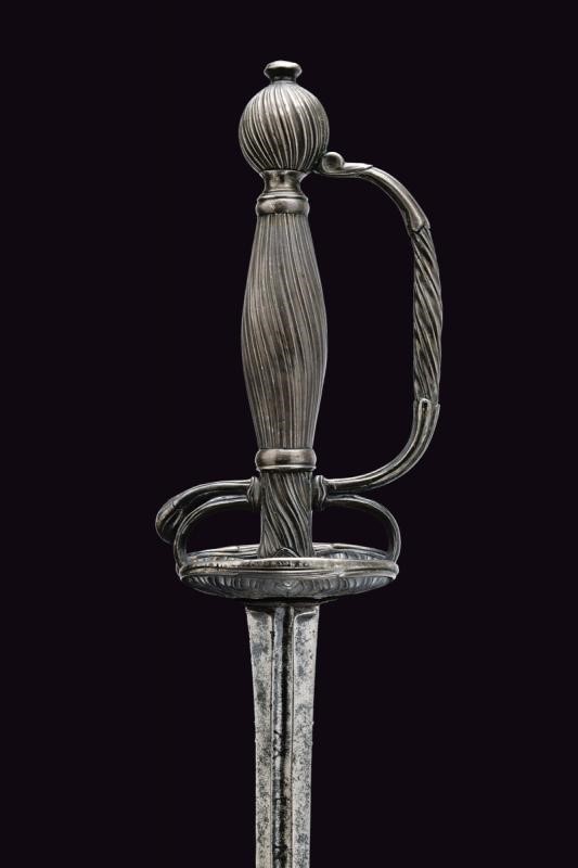 Straight blade of lozenge section, the first part grooved in the middle, with remains of inscription. Typical hilt entirely made of silver, decorated with oblique grooves. Remains of a mark. Good quality.