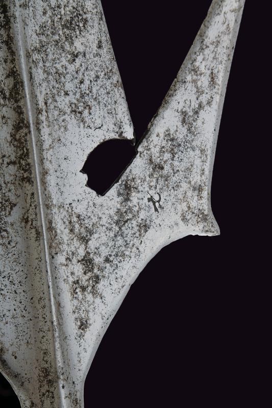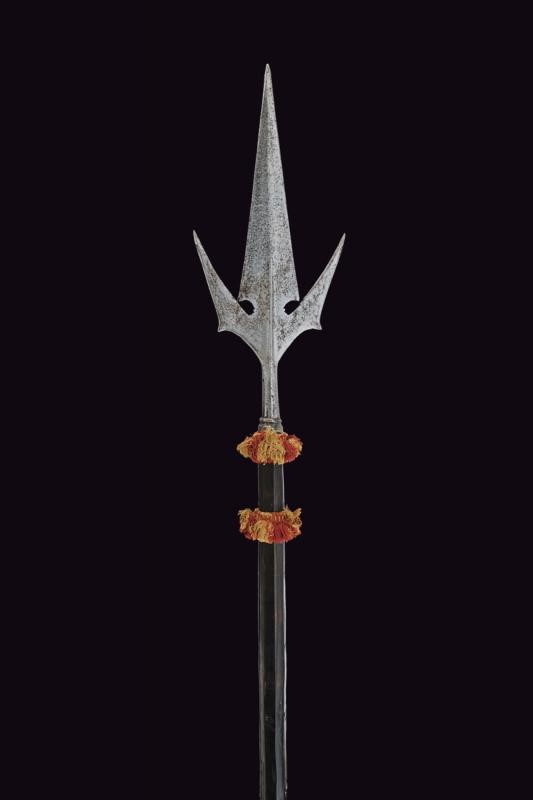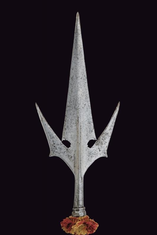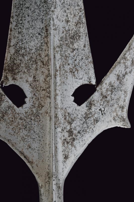 Spearhead with a triangular, double-edged blade, provided with base ribbed at the center and a slightly reinforced tip, the base strongly tapered. Double-edged wings provided with a thickened tip and small humps on the outer side. Faceted ferrule, fixed with long straps (maybe with repairs at the base) on a probably later wooden shaft of octagonal section, and two red fabric tassels. Remains of a stamp on both wings.
