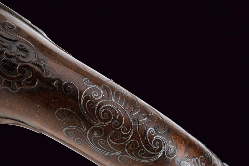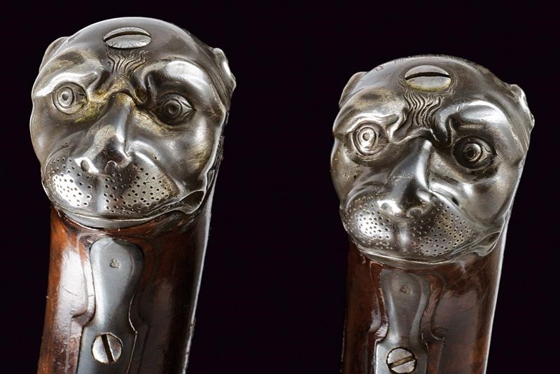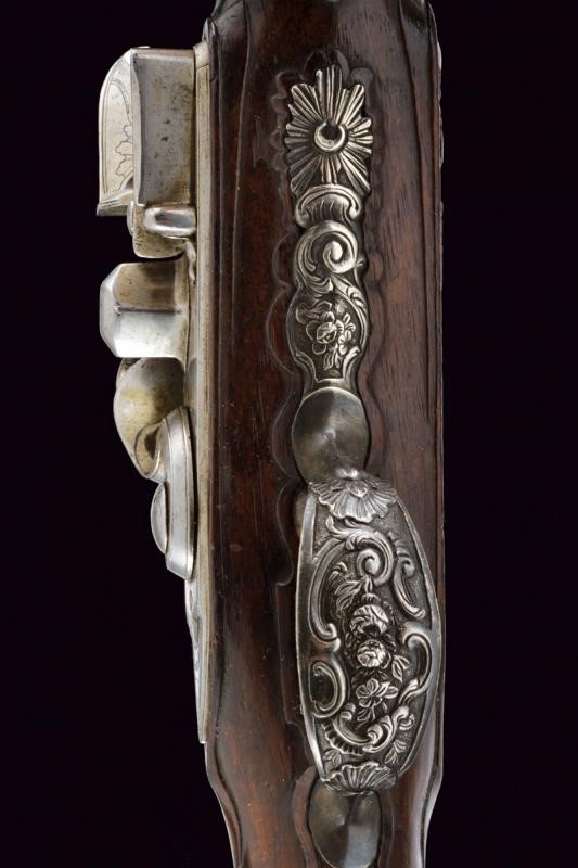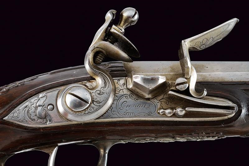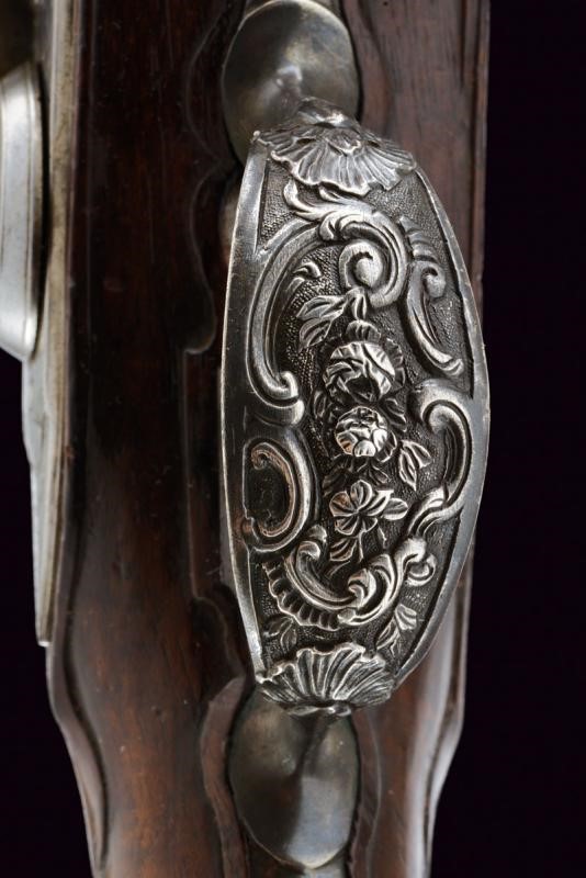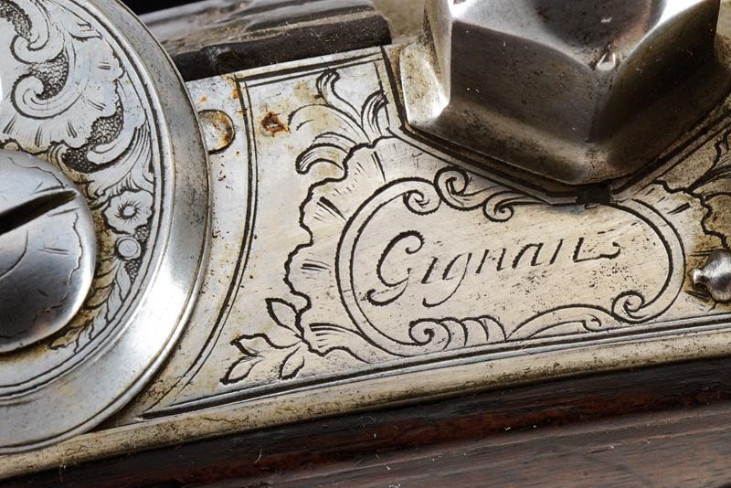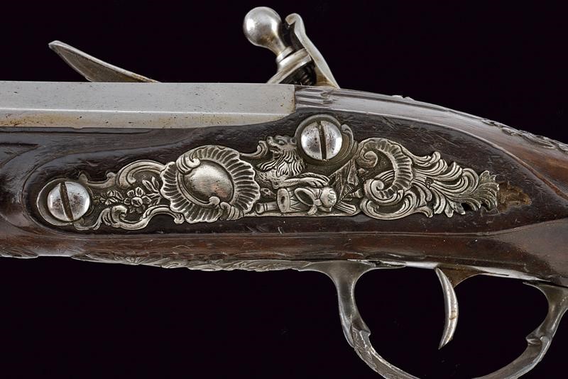 Two-stage, smoothbore, 15 mm cal. barrels with foresight and moulded nozzle; flintlocks signed 'Gignau', finely engraved with floral motifs and with lowered tang. Wooden full stocks sculpted with floral motifs, butts decorated with filigree. Silver mounts, counterplates with lion, trophy and rocaille, trigger guards with floral motifs, front parts with half moon on rays, pommels shaped as a dog's head. Silver marks. Iron-tipped, wooden ramrods with iron cartridge extractors. Silver parts in dark patina.