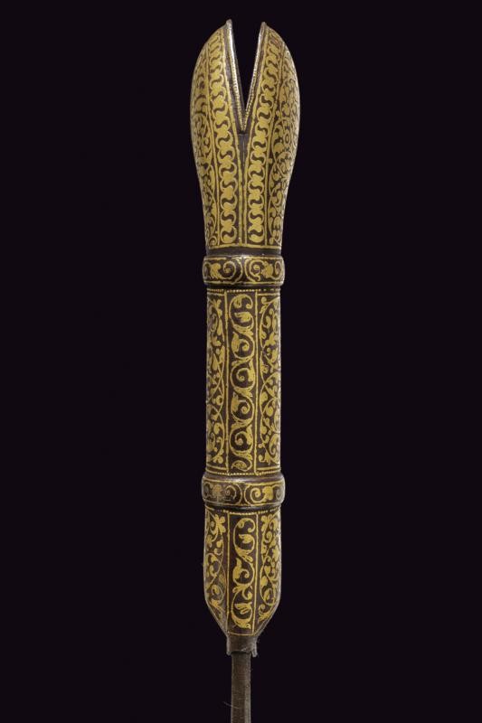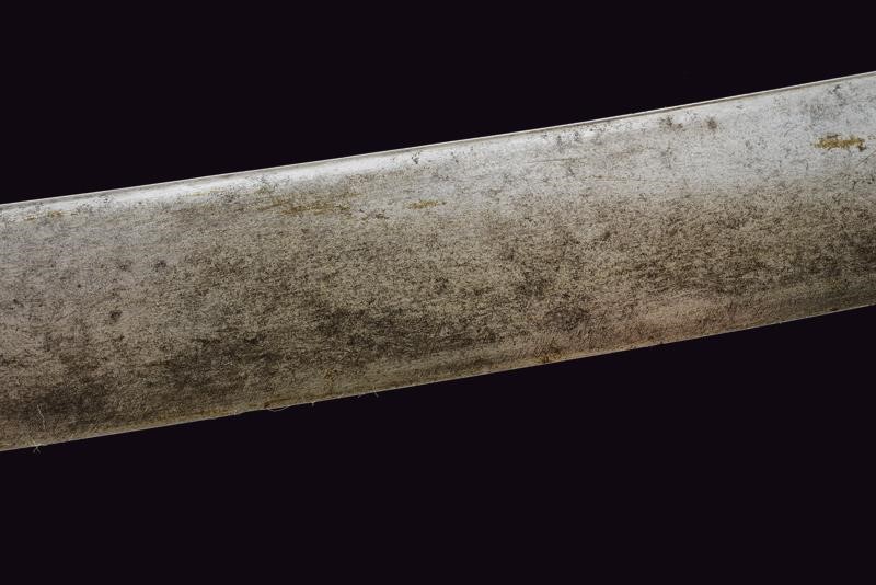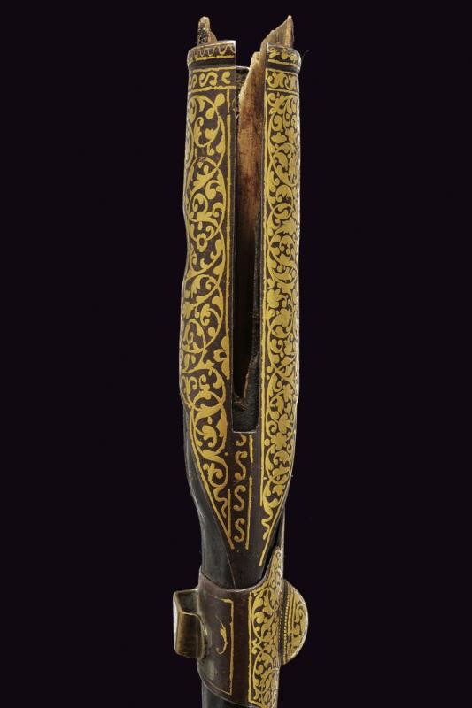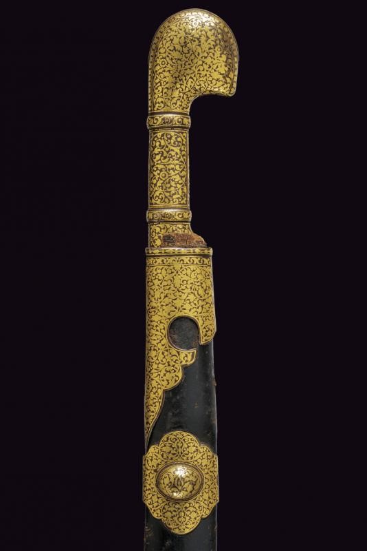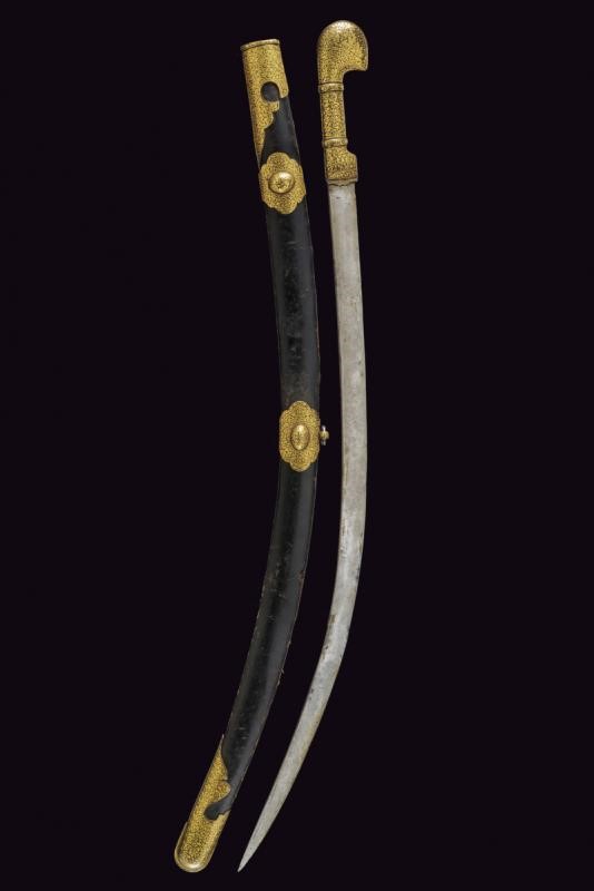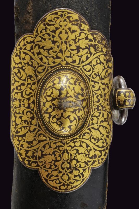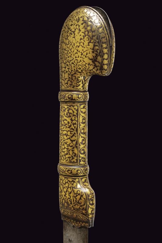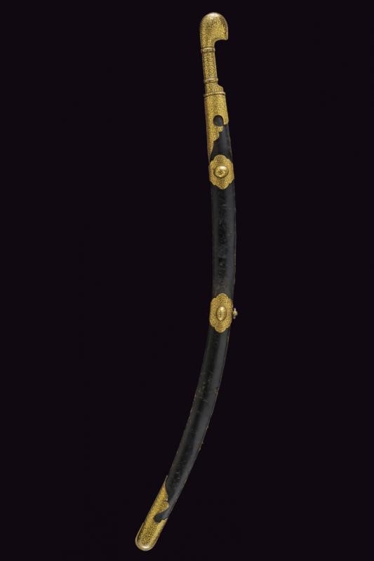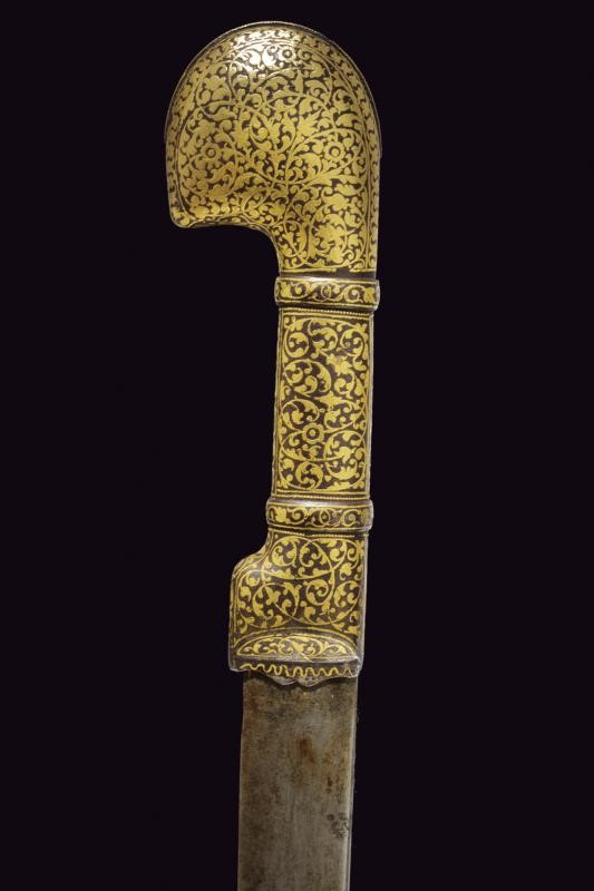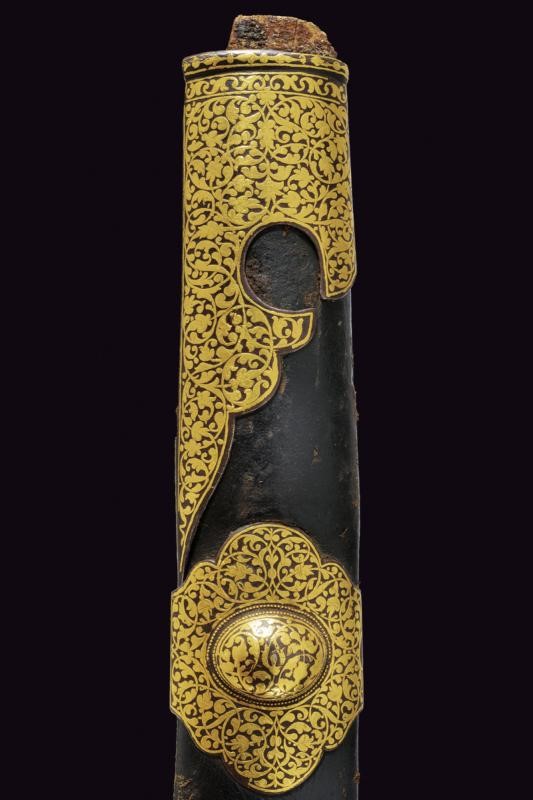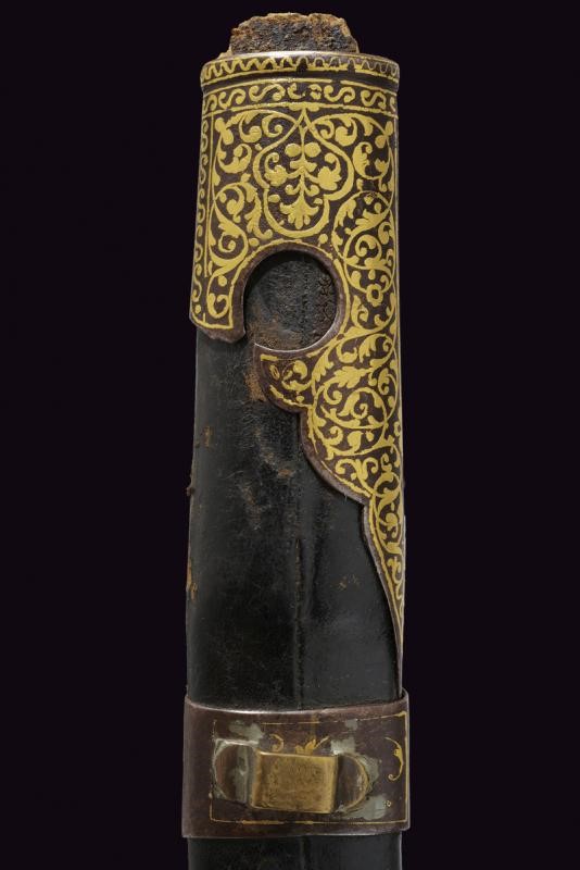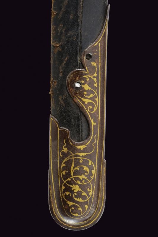 Curved, flat blade of fine damask, round at the back; typically shaped, iron grip entirely decorated with gold inlaid floral motifs; wooden scabbard with leather covering and iron mounts decorated en suite, two flower-shaped bands convex at the center, one provided with a suspension ring, the other with a loop at the back.