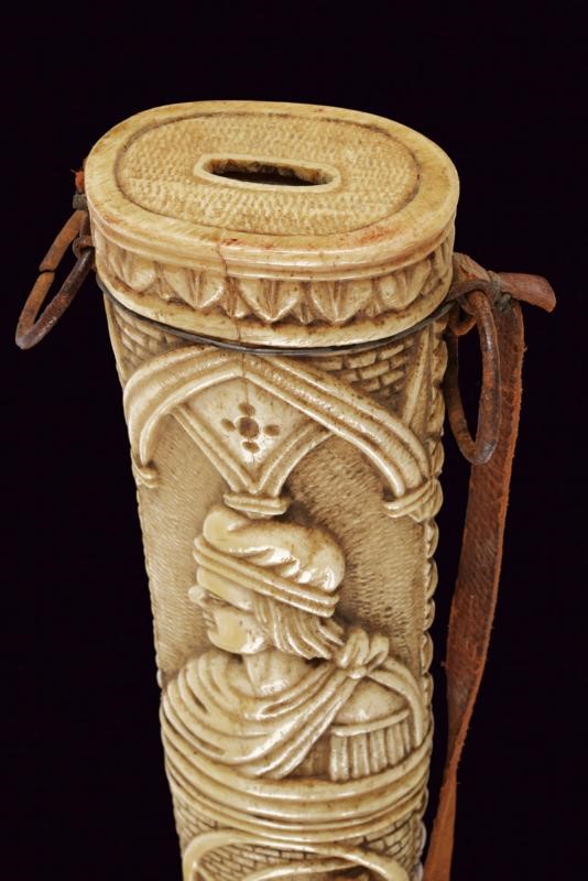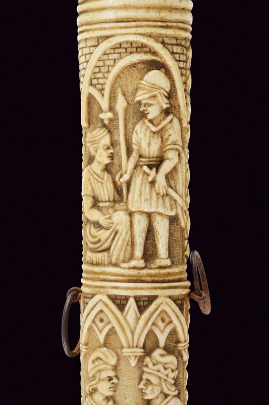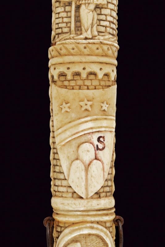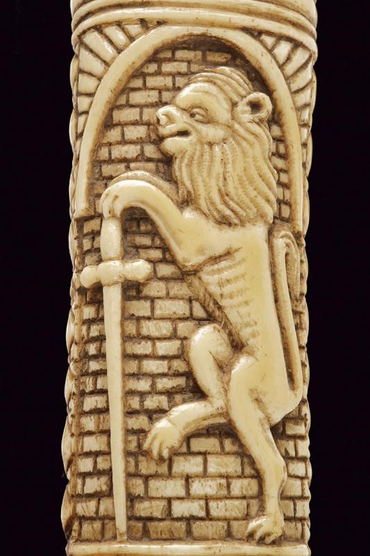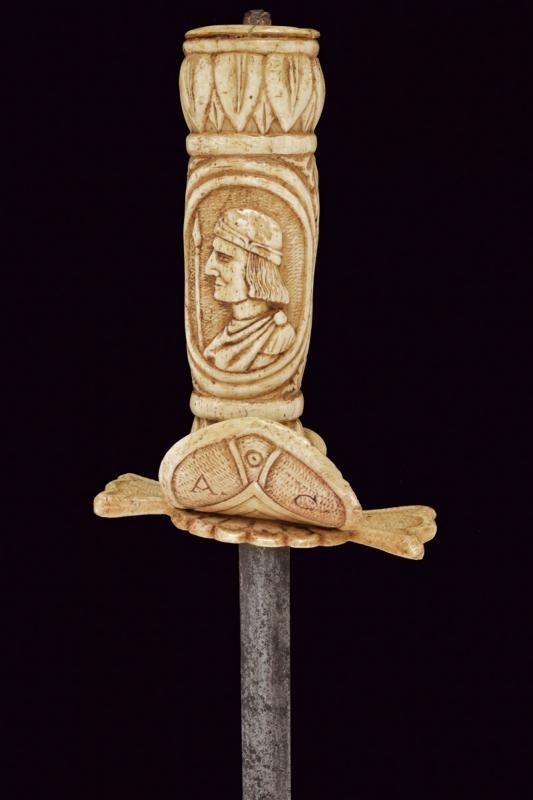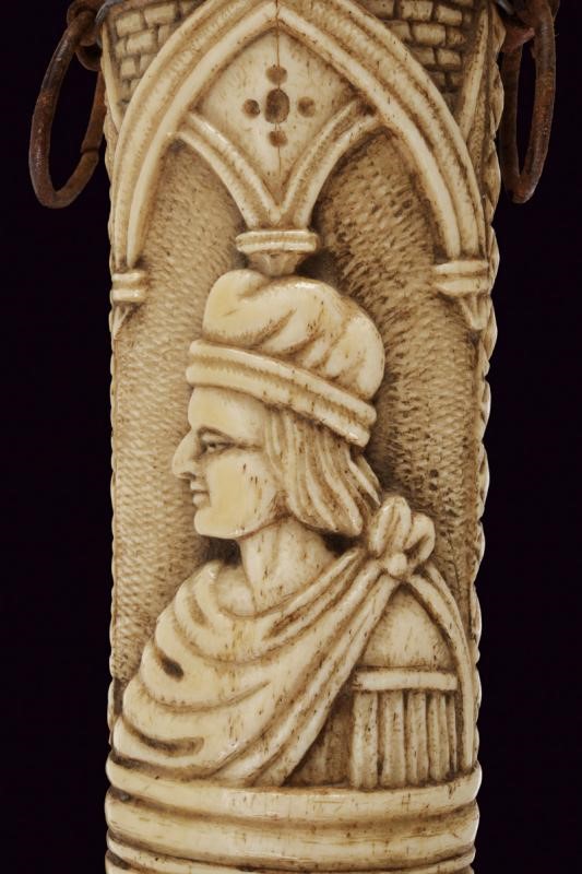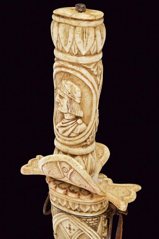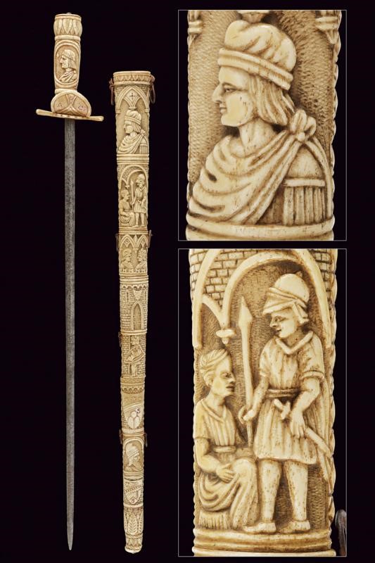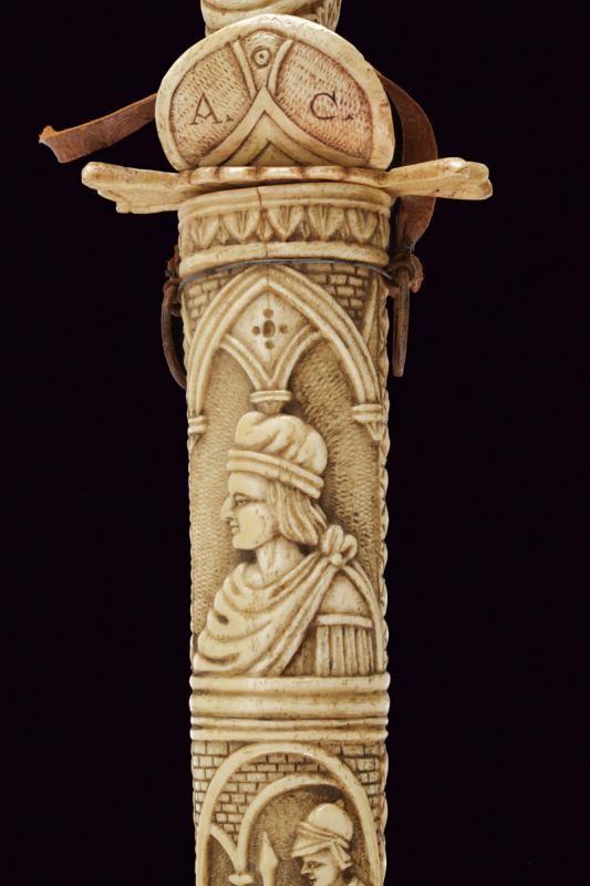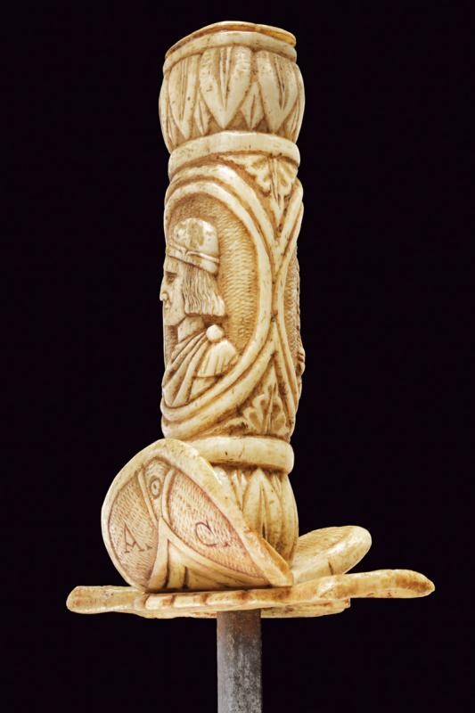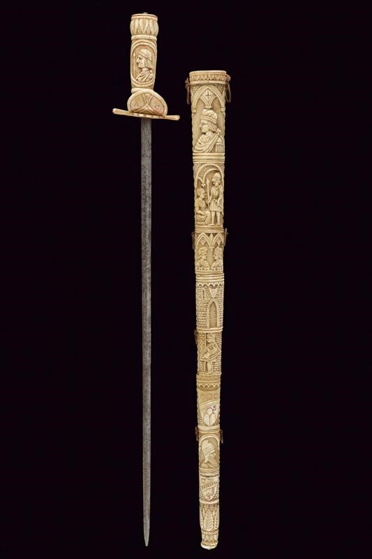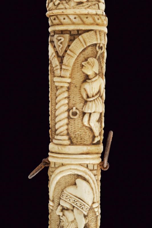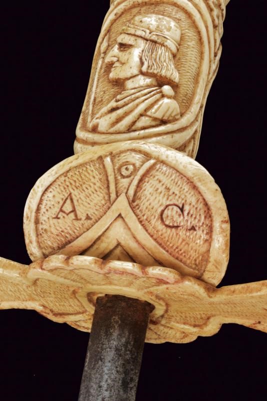 Straight double-edged blade of lenticular section. Hilt consisting of various pieces of bone with small engraved knuckle guard and with monogram 'A. C.', hilt with leaves and handle with two busts in relief between floral motifs. Scabbard worked en suite, richly carved with figures, a lion, a castle, a man on horseback, a prisoner in chains, several shields with coat of arms and others. Six suspension rings.