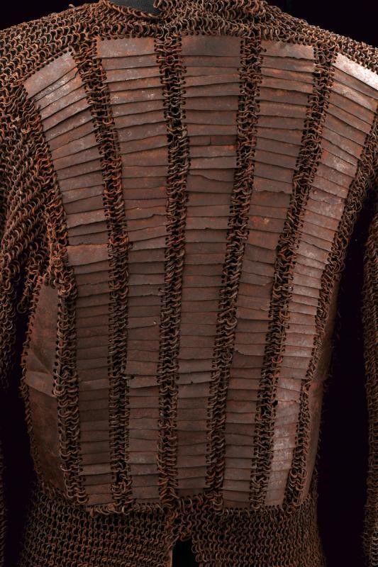The front part with four large convex rectangular iron plates, each provided with two buckles. Two plates also on the sides. The backplate has five rows of scales, plus two external plates on each side. Everything held together by sturdy rings of various diameters with riveted closure. Small missing parts and defects. In patina, it needs cleaning.