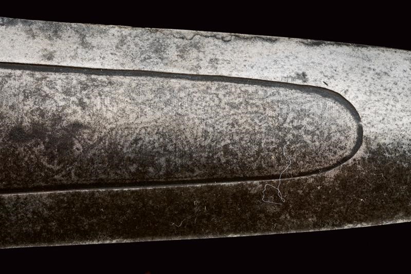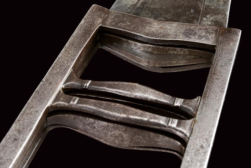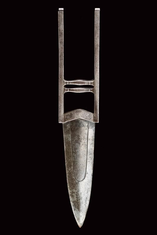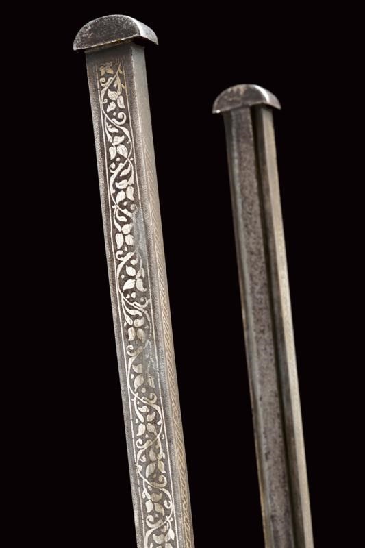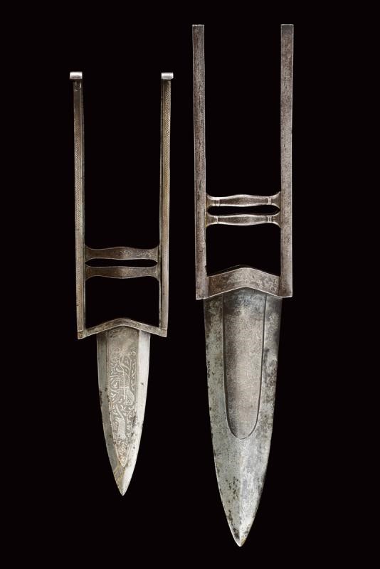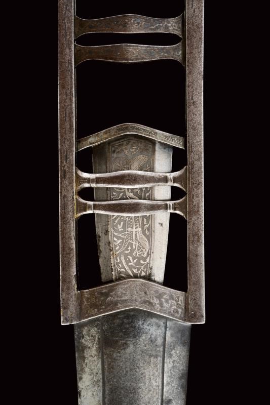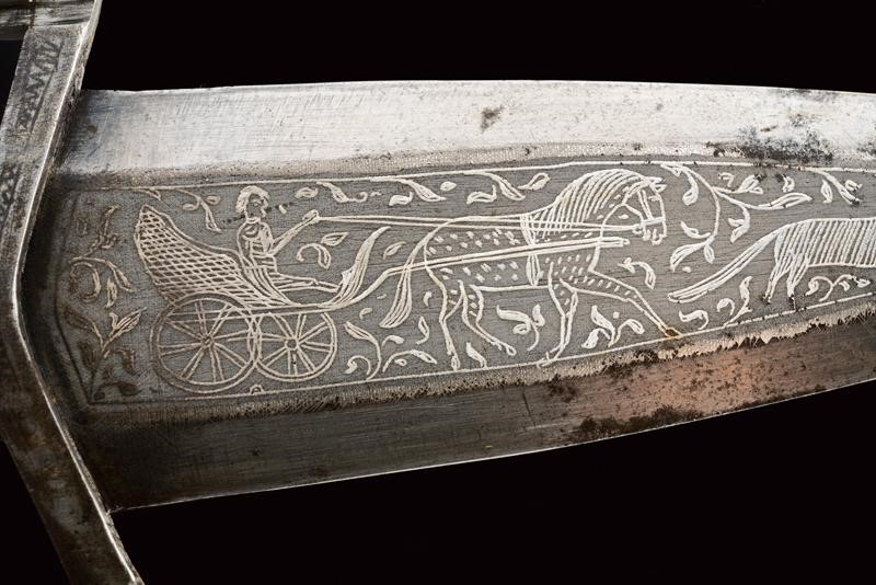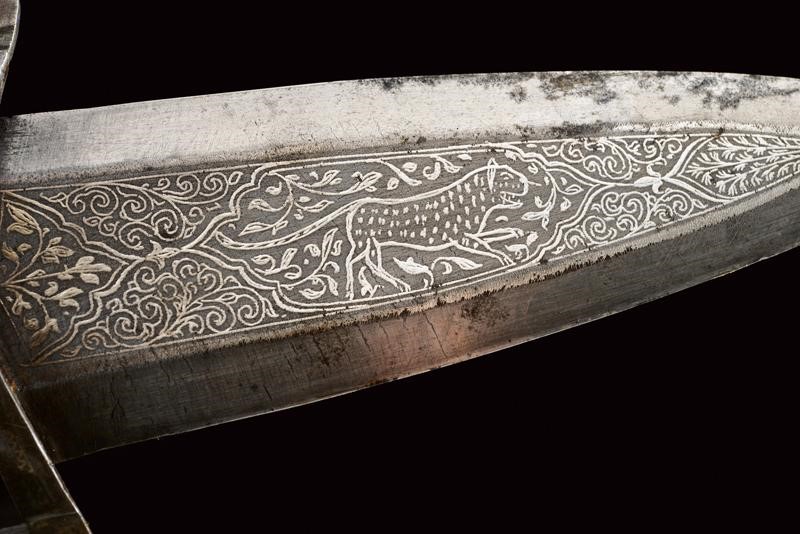 Entirely made of iron. Straight, double-edged blade of lenticular section, double crossed-bar hilt. Remains of silver decorations. The second katar inside, with double-edged blade, slightly grooved at the centre and decorated with silver floral motifs and with the effigy of a tiger on one side, and with a carriage, a horse and a dog among floral motifs on the other. Double crossed-bar hilt, silver decorations in better condition than the external katar.