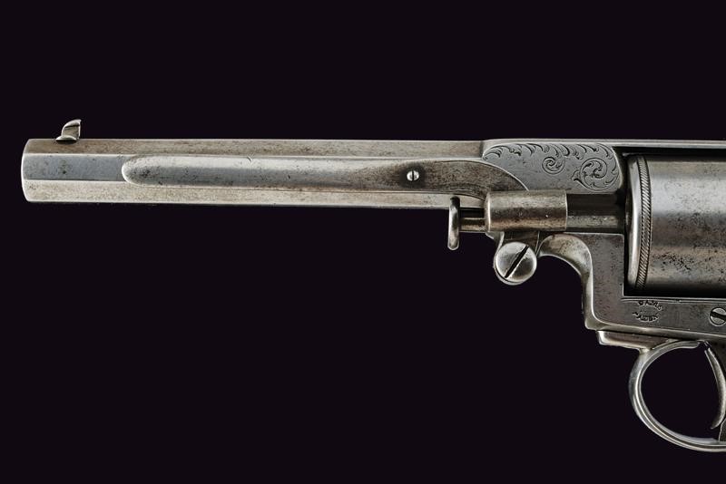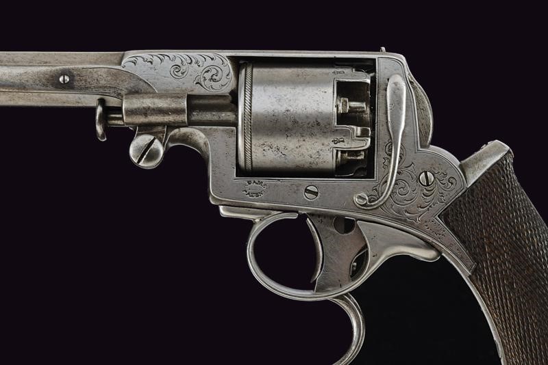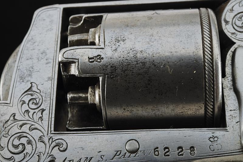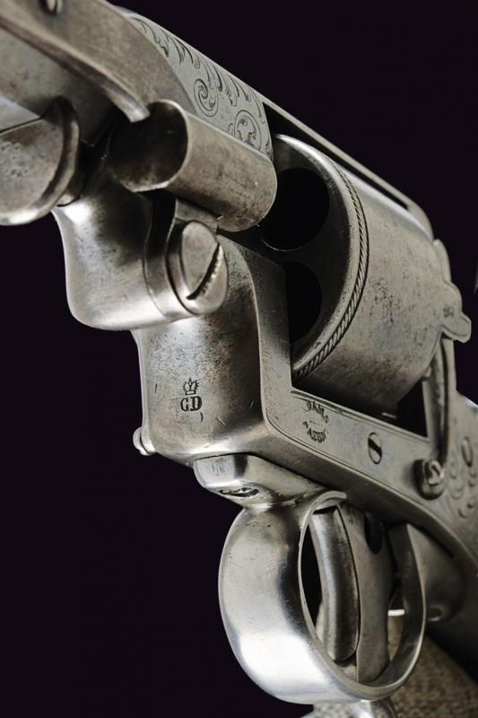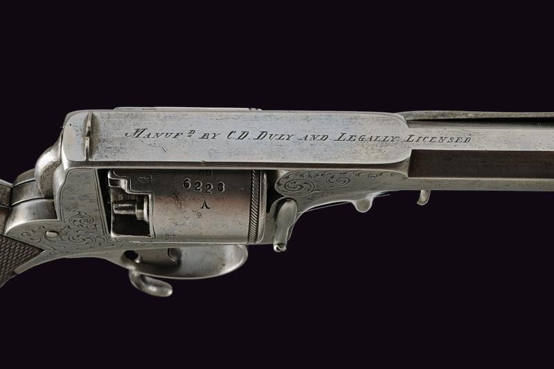 Rifled, octagonal, 11 mm cal. barrel, with foresight. Smooth, five-shot cylinder, with engraved front border, marked "CD" under crown, "D" under crown, "AF" under crown "A", with serial number "62xx" and with mark of the Liège test bench. Frame marked "CD" under crown and "ADAM'S PATENT" on one side and with Adams' 1851 mark on the opposite side; above marked "MANUF.D BY C. D. DULY AND LEGALLY LICENSED" and engraved with floral motifs, side cartridge rammer. Checkered, wooden grip scales, engraved iron butt-plate. Working mechanism.