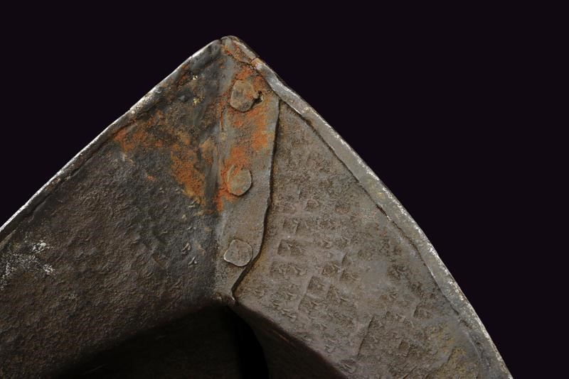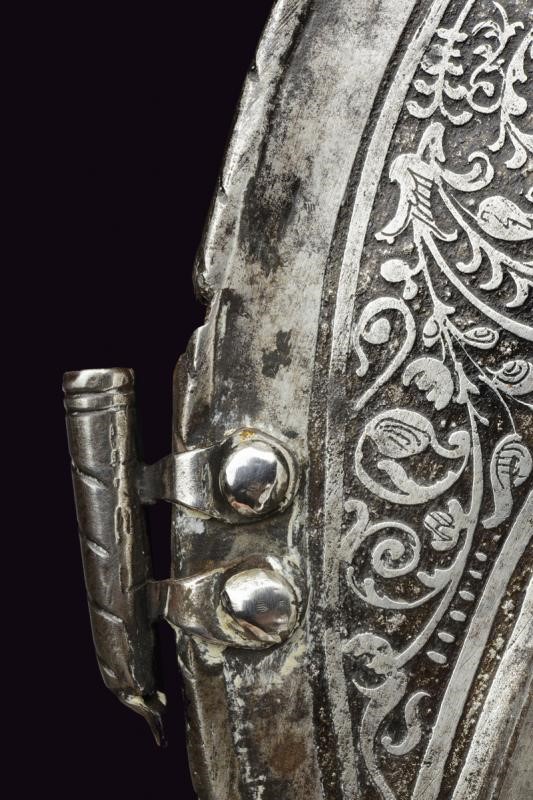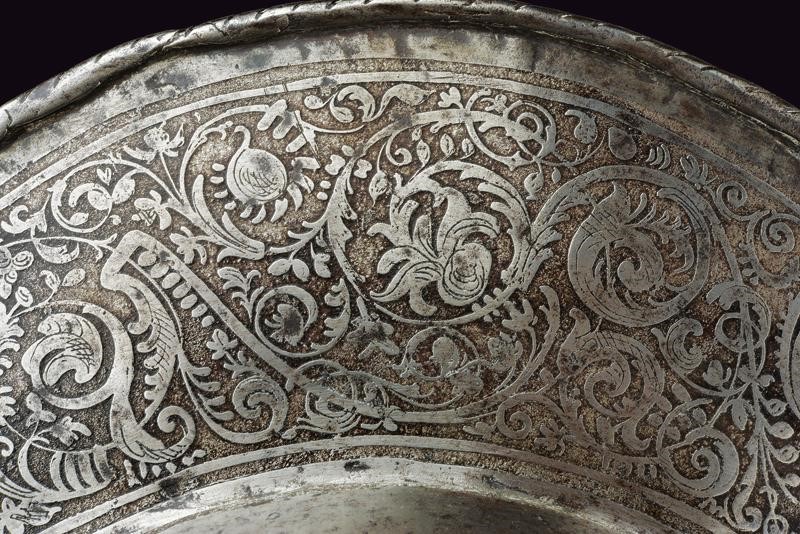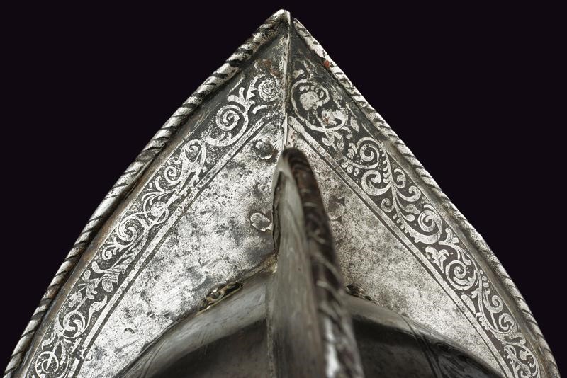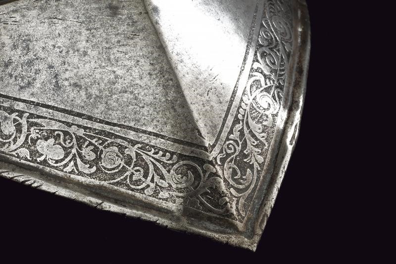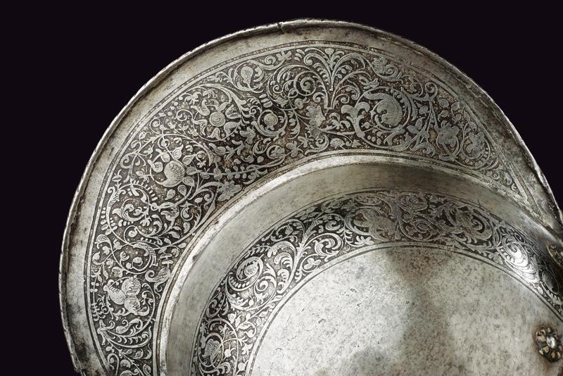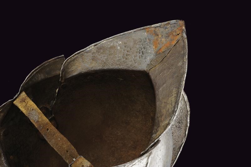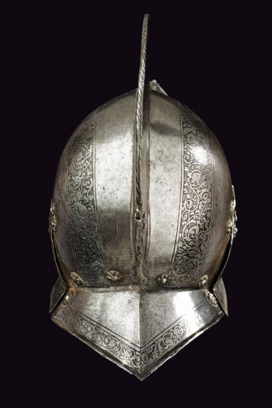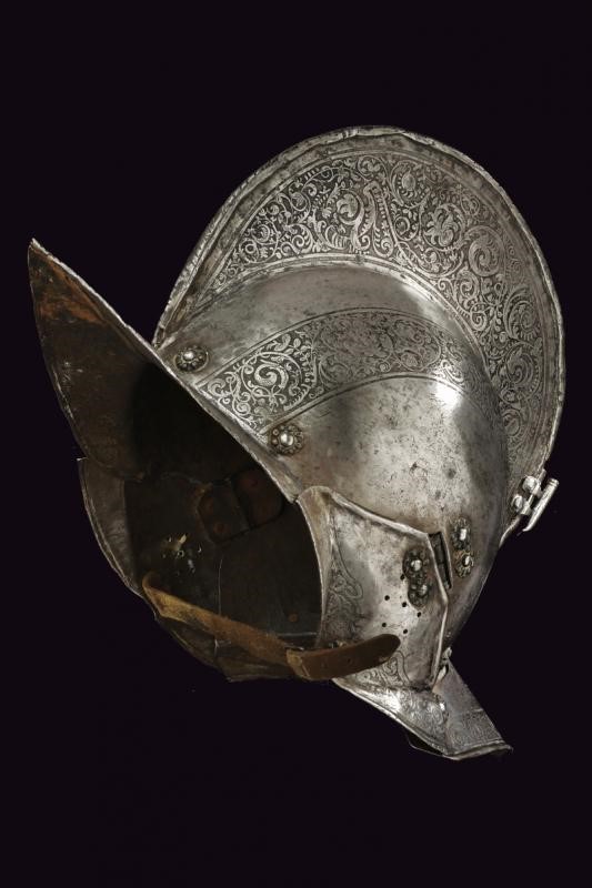 Iron with skull worked in two halves with a medium-high comb with a roped border, pointed brim worked in one piece with the two halves of the skull on the right side with remains of a mark, ribbed nape-guard blade, wide movable cheek-pieces pierced like a rosette. The edges of the brim, nape-guard, and cheek-pieces are roped. The comb, two bands of the skull, and the border are finely engraved with floral motifs on a dark background. Small riveted plume-holder, row of rivets with rosettes. Inside, clearly visible traces of hammering. Very small defects and missing parts.