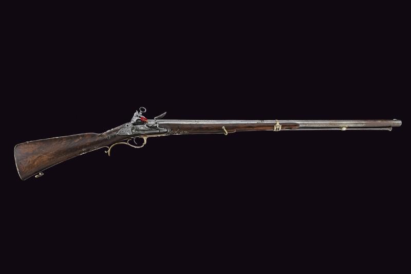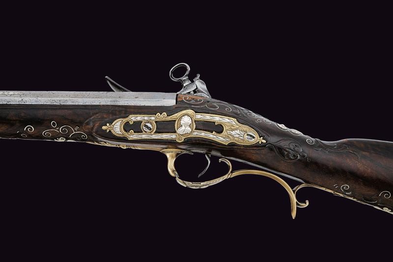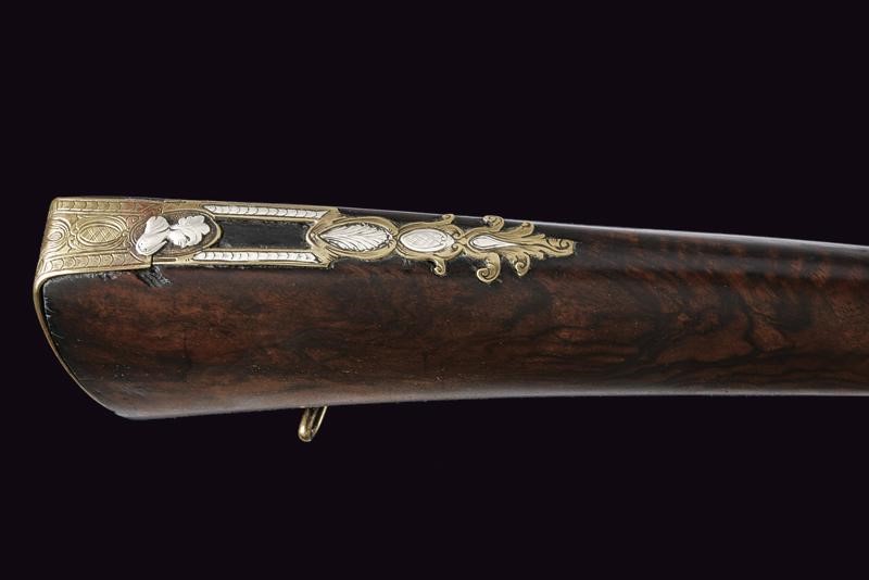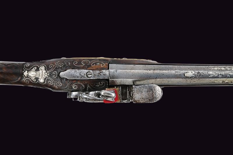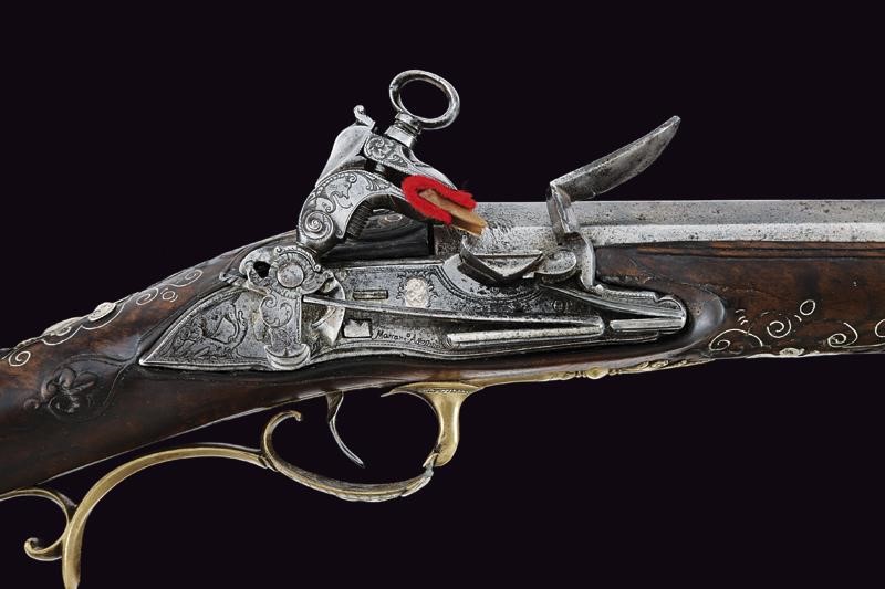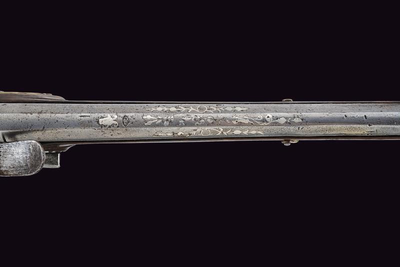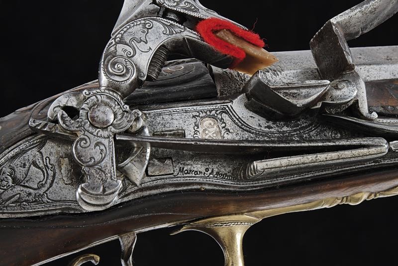Smoothbore, two-stage, probably earlier, 18 mm cal. barrel, first octagonal with mark and silver-inlaid floral decoration, then round with ring at the girdle and silver swallowtailed foresight. Elegant miquelet lock carved and engraved with floral motifs, signed "Mariani/o Agostino" (? the surname not clearly legible), with silver-inlaid mark. Working mechanism. Three-quarter stock, the two sides of the grip carved with a lily. Beautiful brass and silver mounts with busts, fleur-de-lis, filigree and floral motif decorations. Iron ramrod. Missing parts and restorations, especially at the stock.