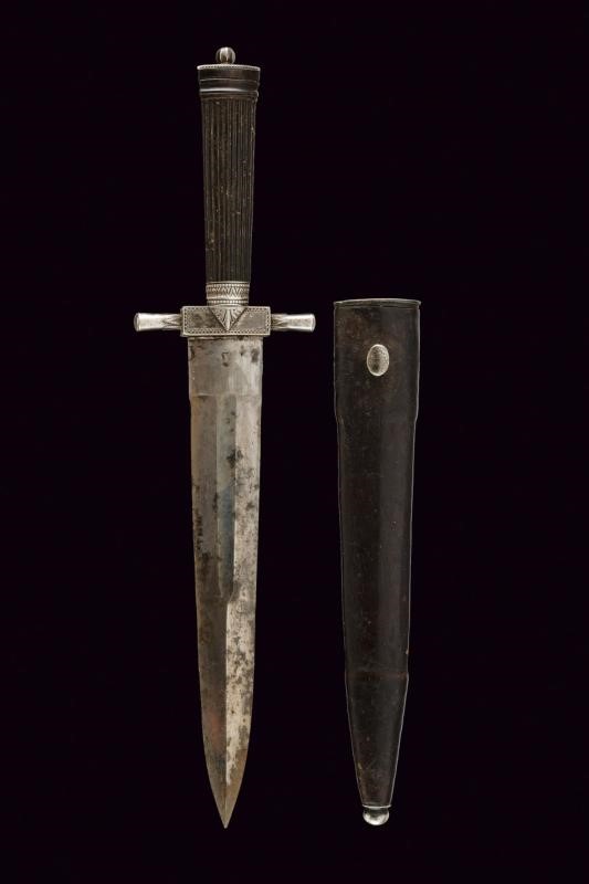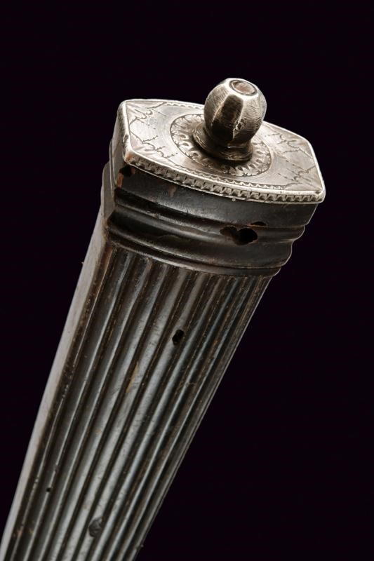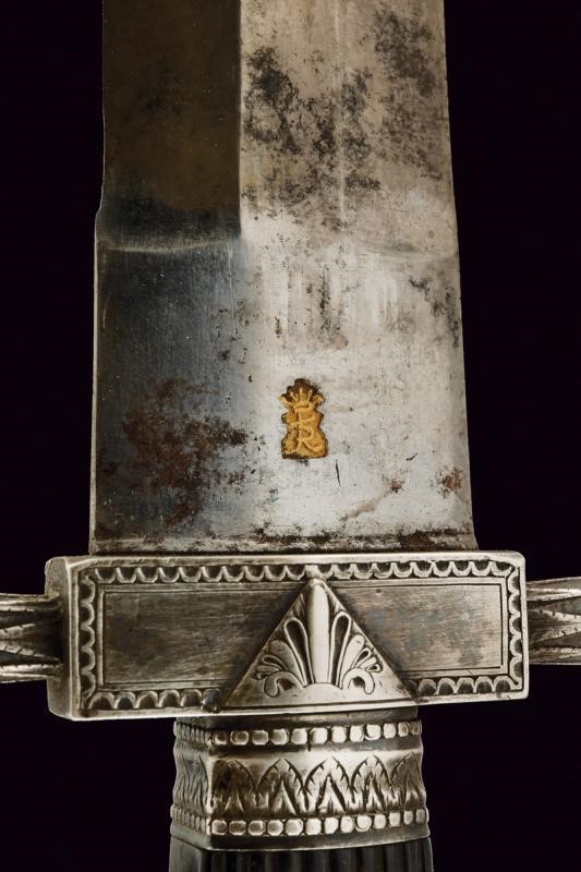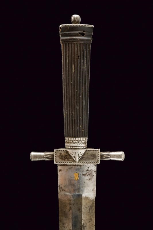 Solid, double-edged blade, lenticular at the tang, hexagonal up to the center and then of lozenge section up to the tip; the tang with two marks of the Royal Factory of Naples, an anchor with gold inlay. French Empire style hilt made of engraved silver. Horn handle (small missing parts) with longitudinal grooves. Leather scabbard with silver mounts.