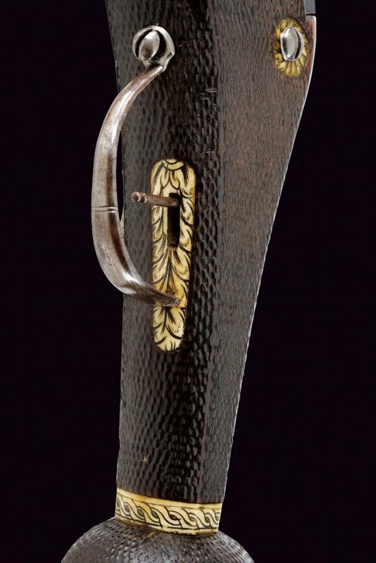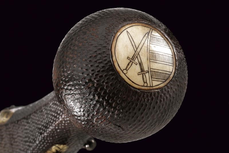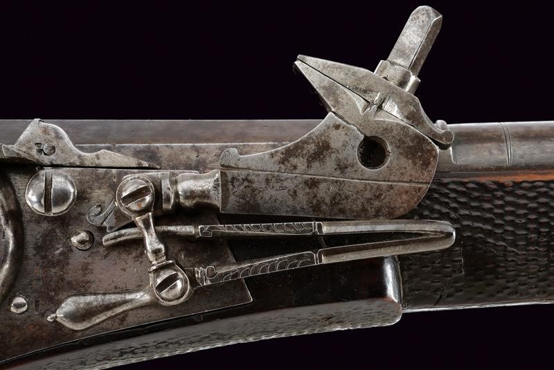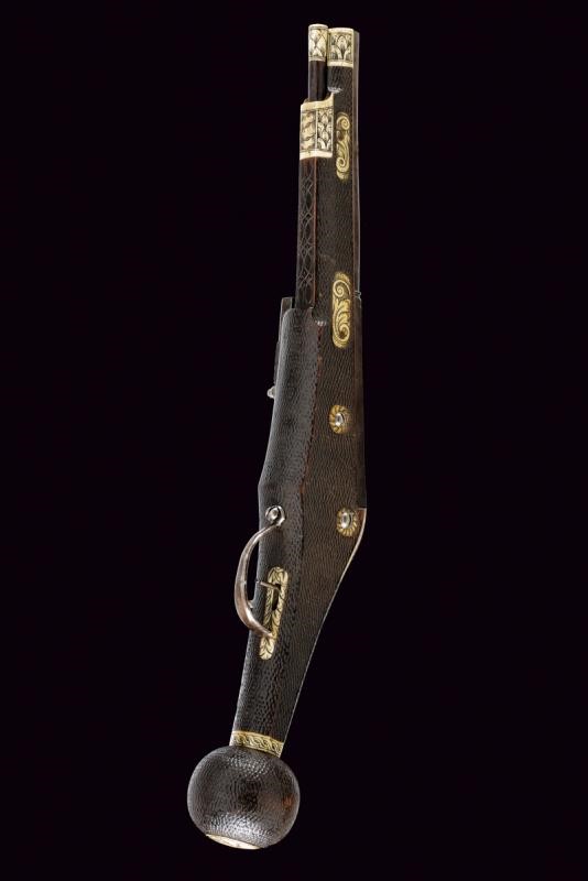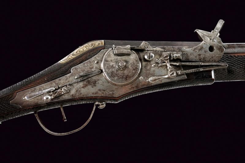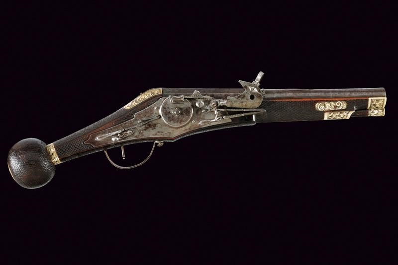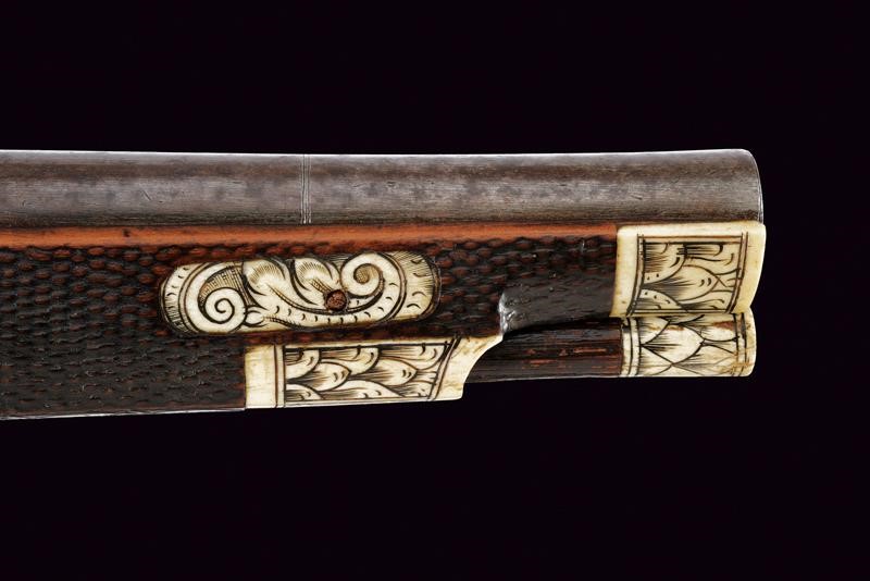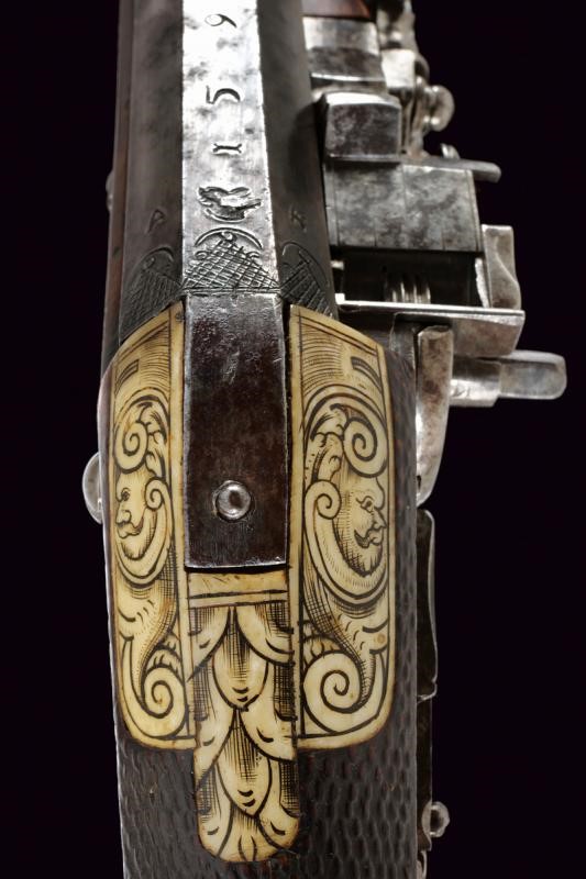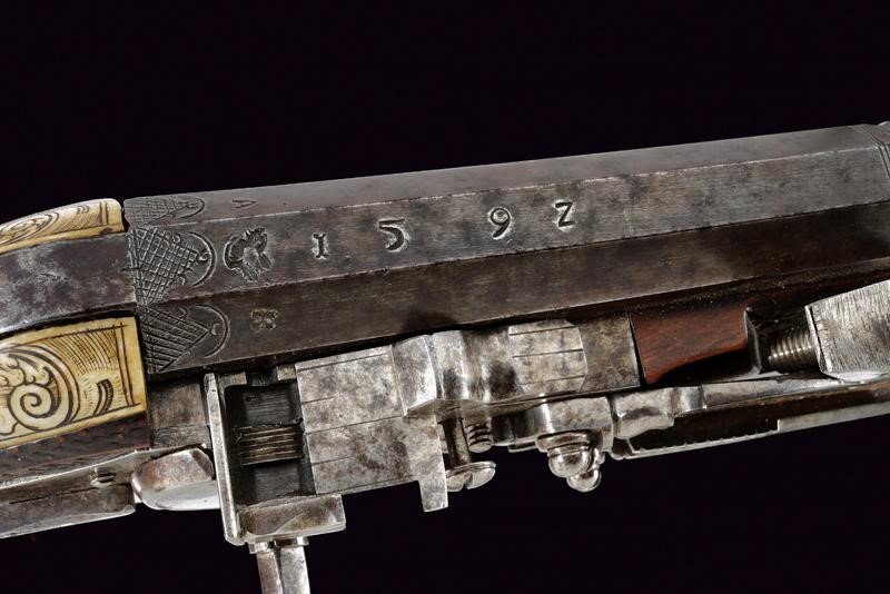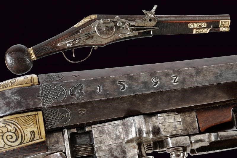 Smoothbore, two-stage, 16 mm cal. barrel, first octagonal with mark "A", "K", mark with a bird and date "1592", the base engraved, after round with a ring and small engravings at the girdle, slightly bell-mouthed nozzle; lock with flat lock plate and external wheel, engraved springs, with safety lock and snap sliding pan cover, inside some engravings. Full stock made of blackened wood, scales engraved with bone inlays; sphere-shaped pommel bearing in the centre a bone medallion with the Saxon royal coat of arms. Bone-tipped wooden ramrod and iron cartridge extractor.
