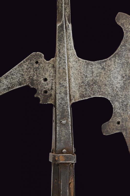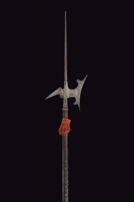 Spearhead with a solid cusp of square section, slightly hollow-edged axe and with cusped upper tip, broad, almost square humps with central open work. Straight rear fluke and slightly pointed downwards, also with enlarged and ribbed cusp. Remains of bands and counter-bands. On a wooden shaft with some missing parts and damaged by wormholes, not of recent production, complete with remains of decorative tassel and studs.