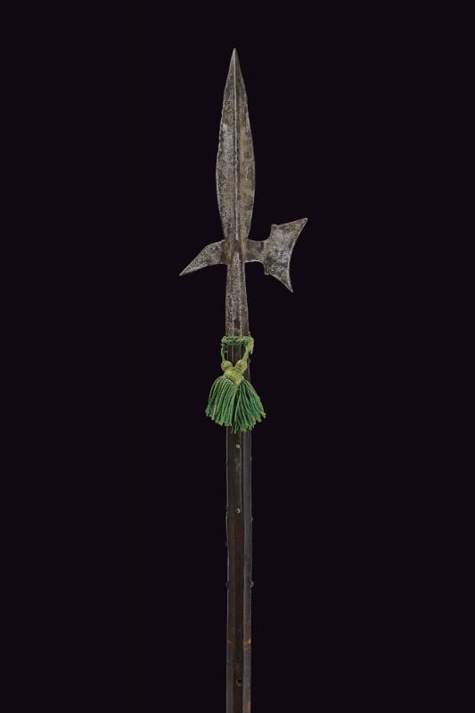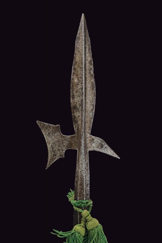 Iron with double-edged cusp shaped as a leaf, ribbed in the centre, small, hollow-edged axe, with cusped humps, rear fluke curved downwards. Pitting and signs of use. In patina. The straps with some missing parts. Set on a wooden, not recent shaft, with woodworm holes and a small green-coloured tassel.