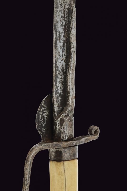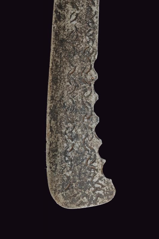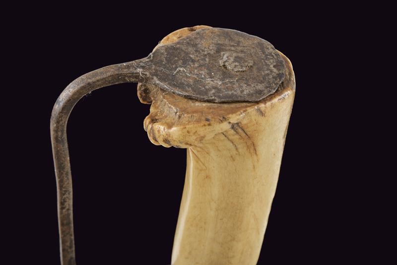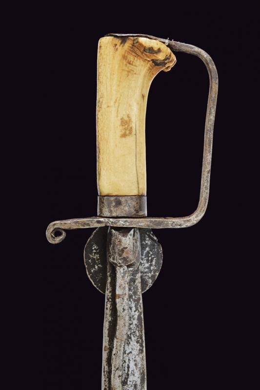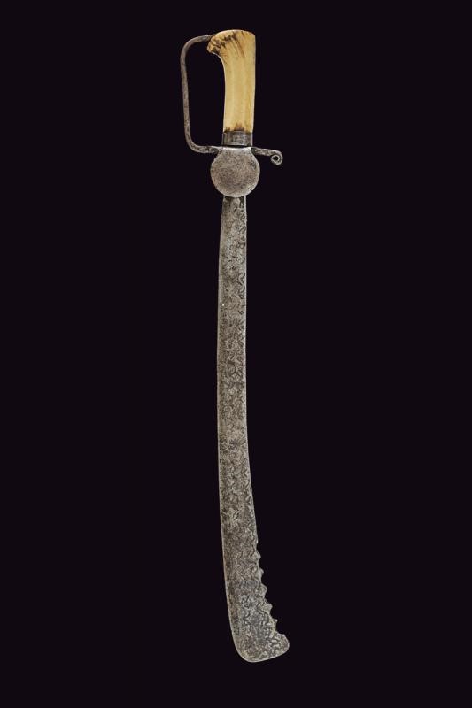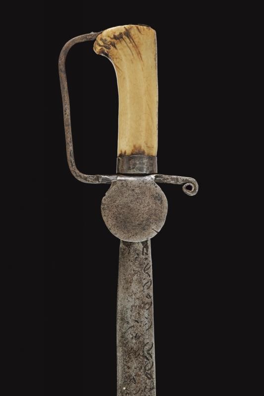 Curved and palmate blade carved with semicircles on the back and engraved en suite on the right side along its entire length. Iron hilt with a circular shell guard, loop guard, and a short curled parry quillon. Iron ring nut. Deer horn grip. An iron belt hook on the back.