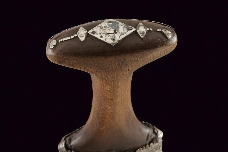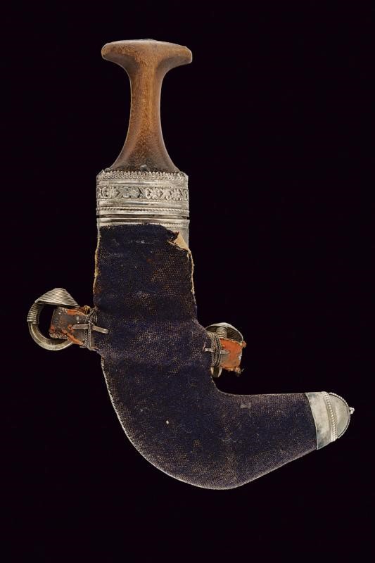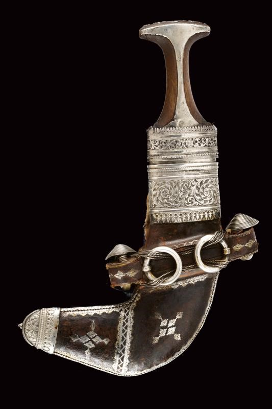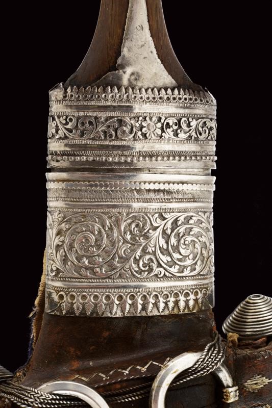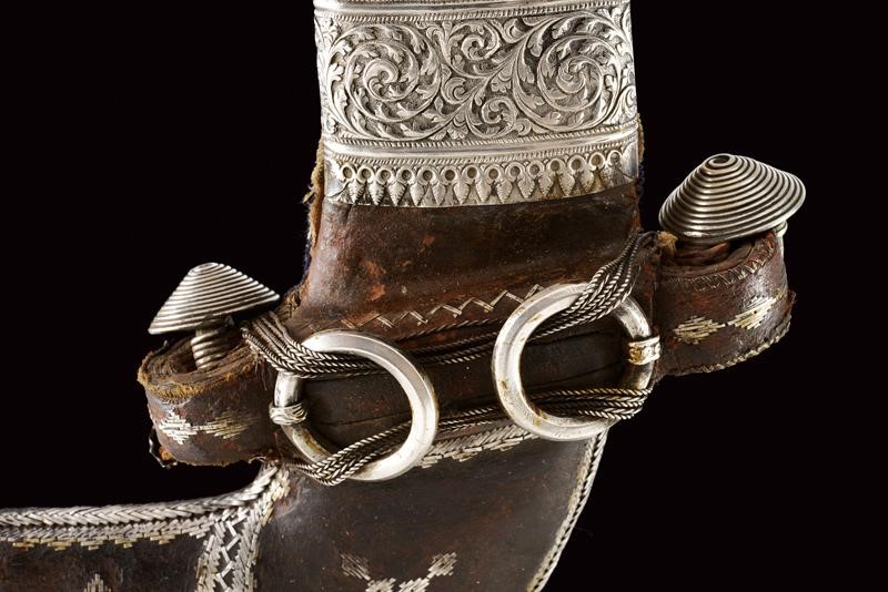 Curved, double-edged blade, with a strongly ribbed at the center. Silver ring-nut decorated with filigree frames and with band engraved with floral motifs. Horn hilt with silver band at the front. Typical, big, wooden scabbard with leather and cloth covering. Silver mounts and thick, central band with rings.