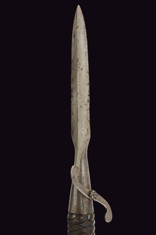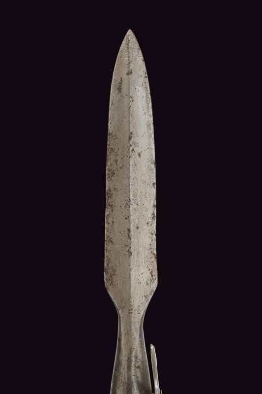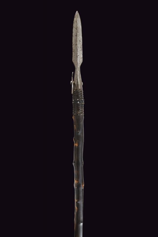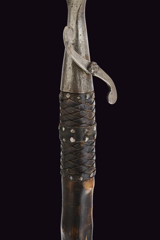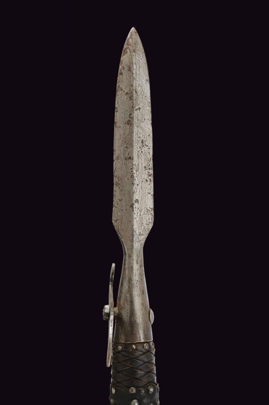 Solid, double-edged cusp at the center and with some pitting, ferrule shaped as a truncated cone with jointed crossbar Thick wooden shaft probably of later date, decorated in the upper part with braided leather bands.