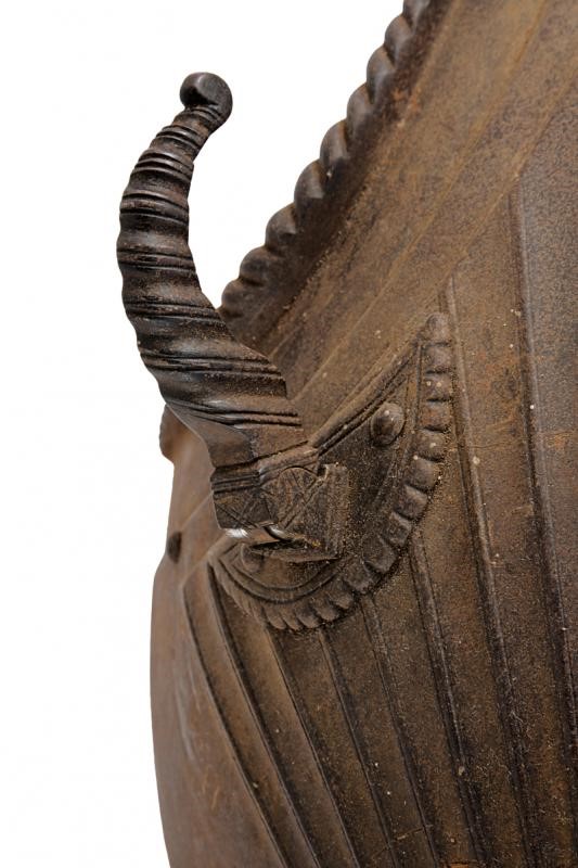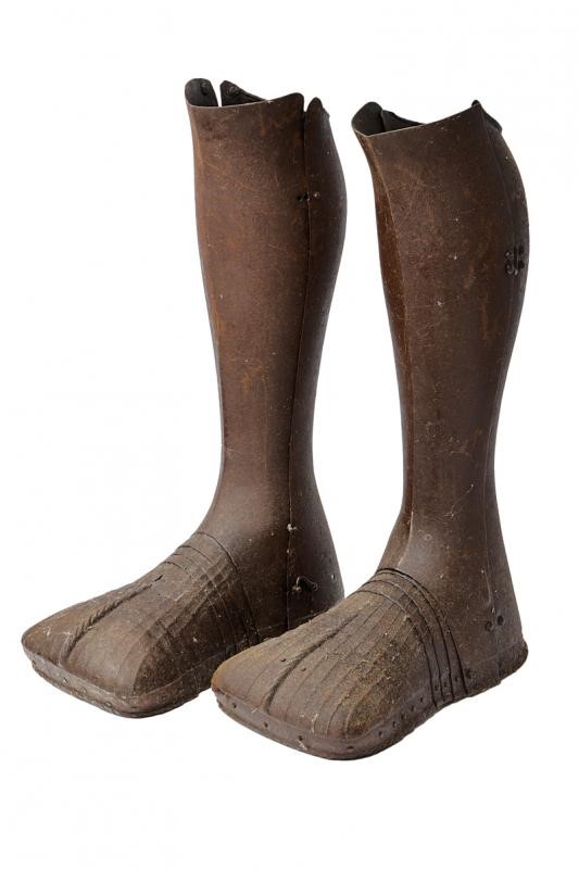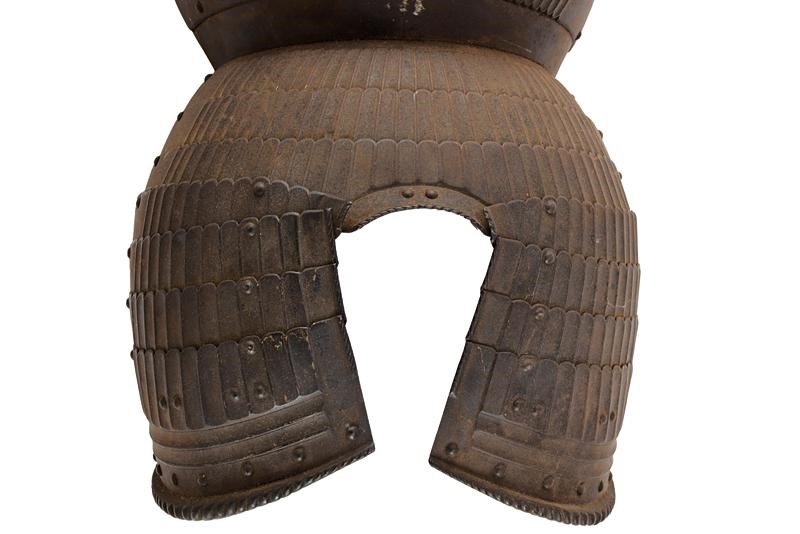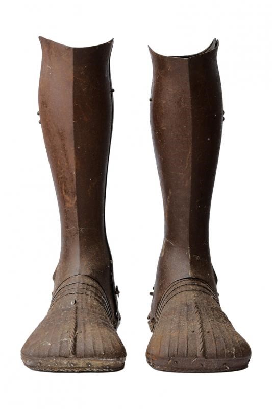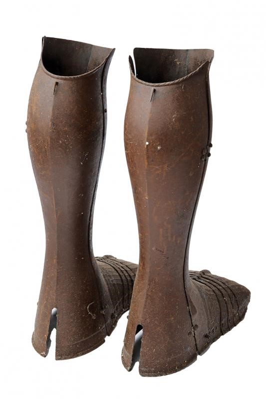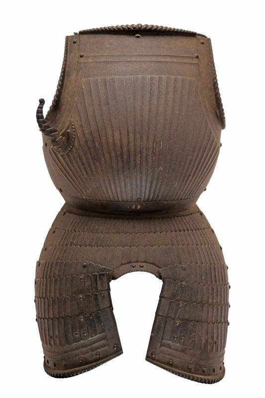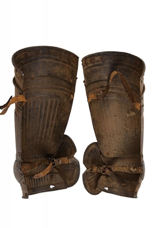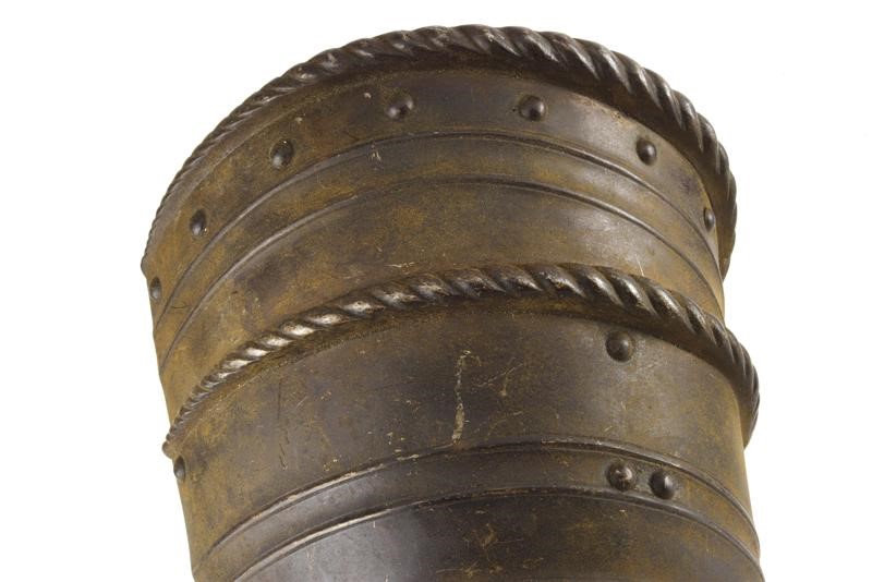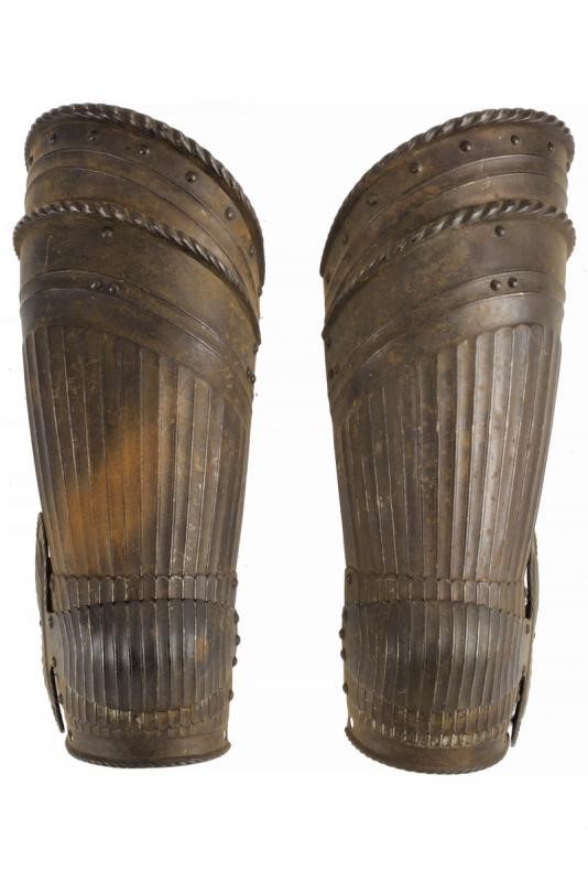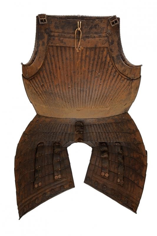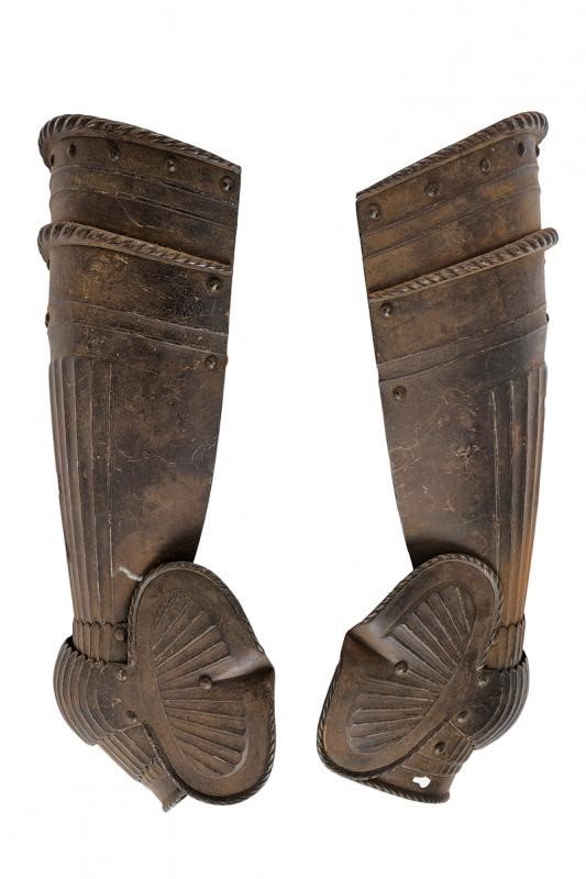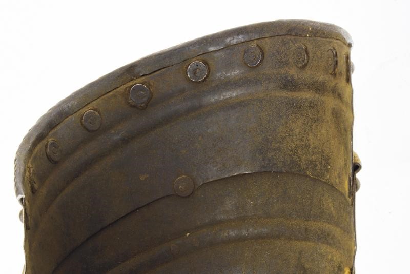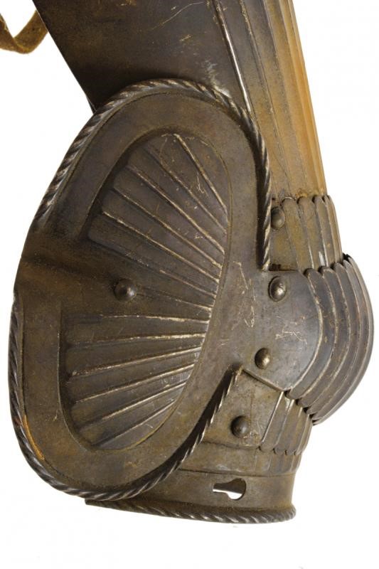 Round breastplate with grooves, smooth and recessed border, raised and twisted neckline, on the right side a rest for the spear. Riveted gussets with border worked en suite with the neckline. One waistplate. Three riveted loin-guards and four riveted tassets, worked en suite with the breastplate grooves. Cuissards (47 cm long) worked and decorated likewise and complete with knee-cops provided with wings. Plain and ribbed greaves, complete with backplates, the boots consisting of seven grooved and riveted plates, the last four with central twisted ribbing (small defects).