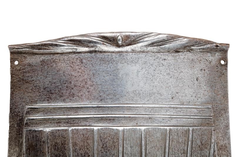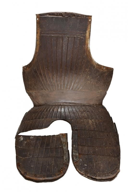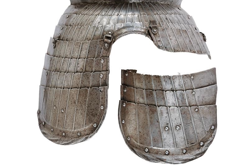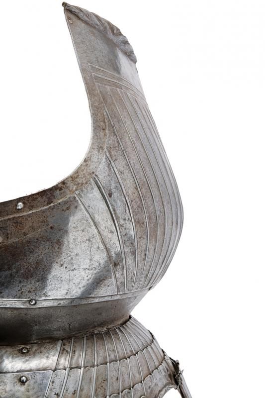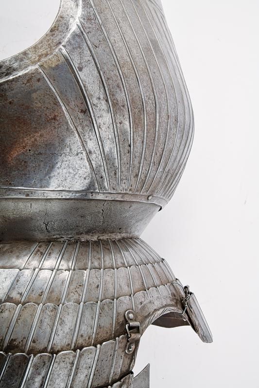 Round breastplate with grooves and ribs, recessed and smooth border, raised and twisted neckline without gussets. Riveted waistplate. Three riveted loin-guards and four riveted tassets worked en suite with the breastplate grooves and with recessed, hemmed and twisted border. Remains of leather strings, the last three plates of the left tasset detached (need to be set).