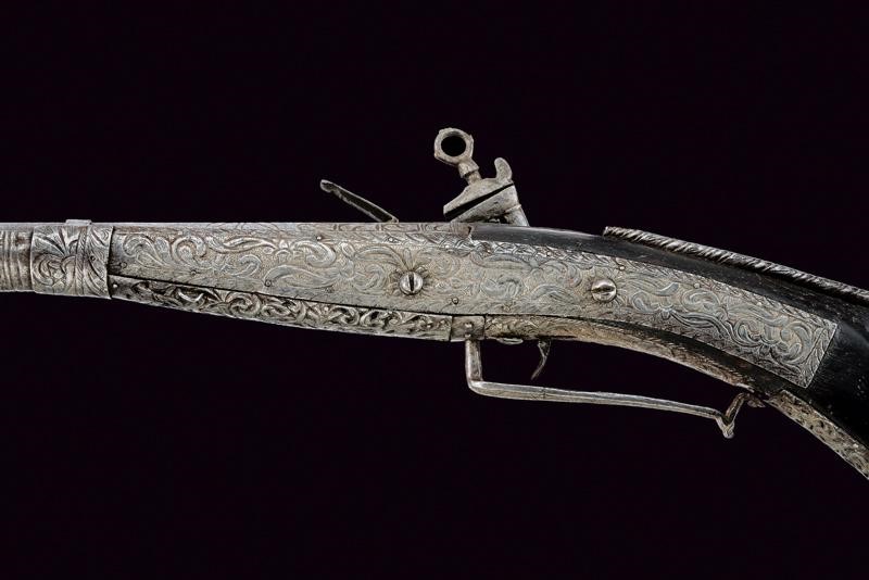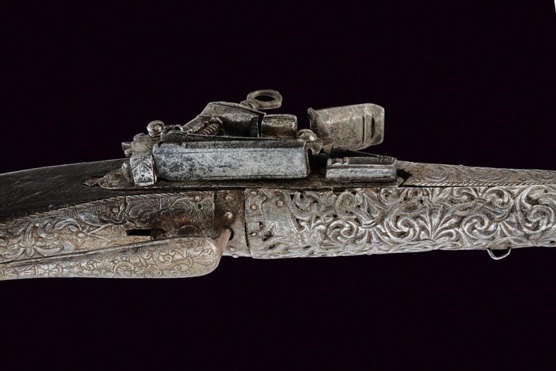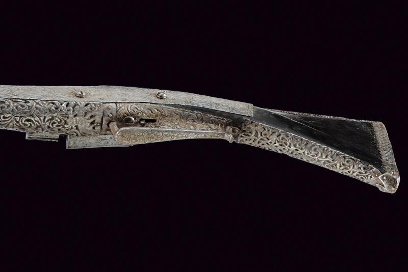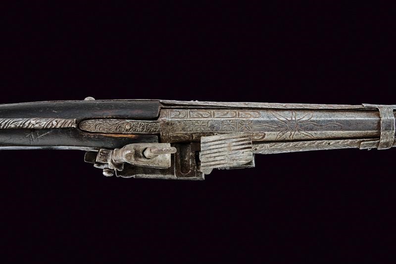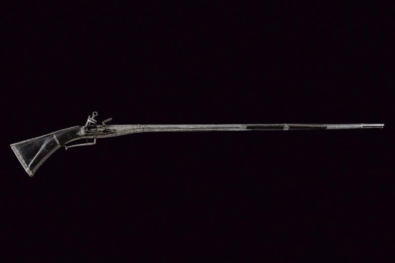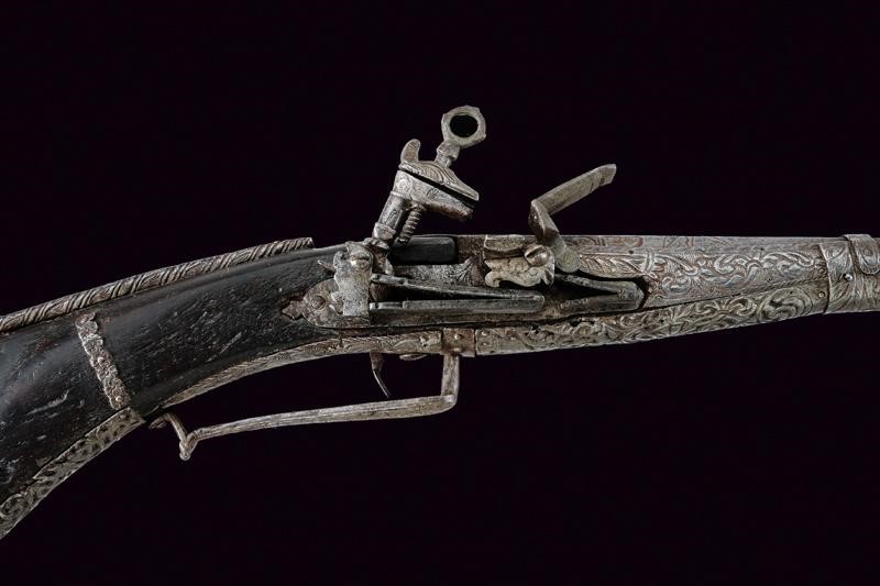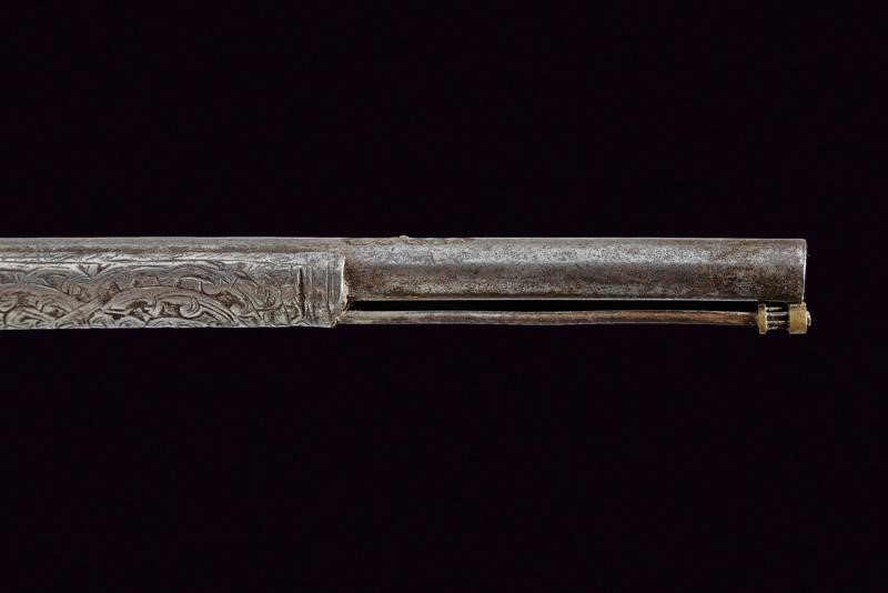 Octagonal, smoothbore, 11 mm cal. barrel decorated with floral engravings and a sun at the base; carved and engraved lock. Wooden full stock partially covered with iron plates, richly engraved and pierced with floral motifs, small missing parts. Iron trigger guard decorated en suite. Iron ramrod.