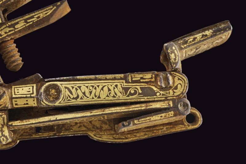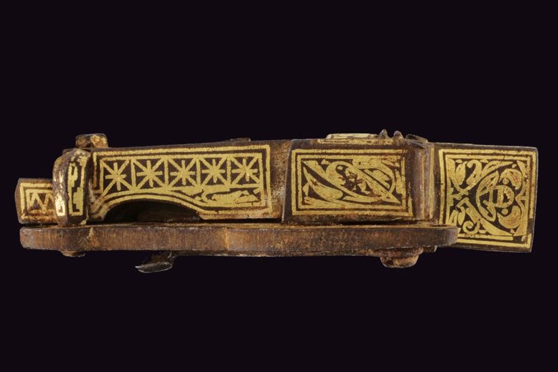 Made of iron, with an Arabic mark, richly inlaid in gold with floral and geometric motifs. The hammer block is missing. Fine lock for a Cossack pistol.