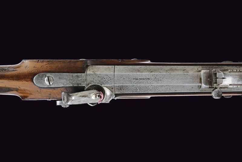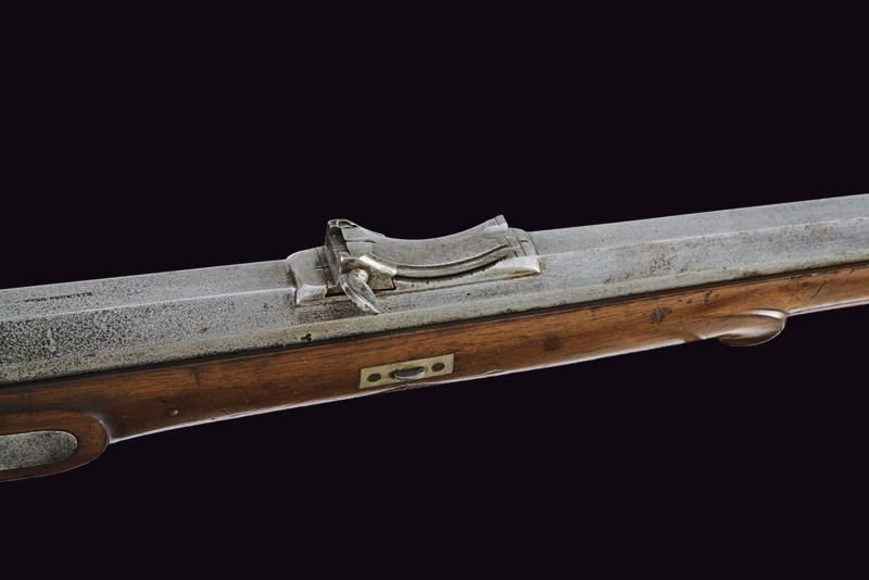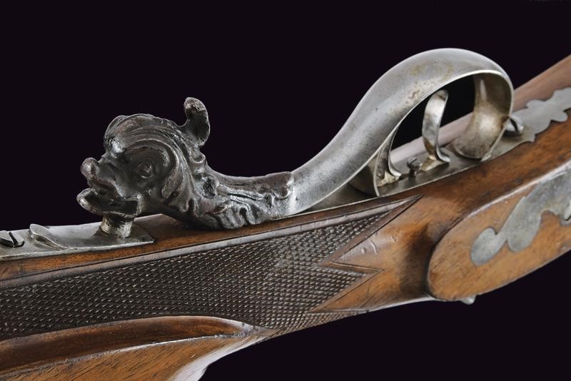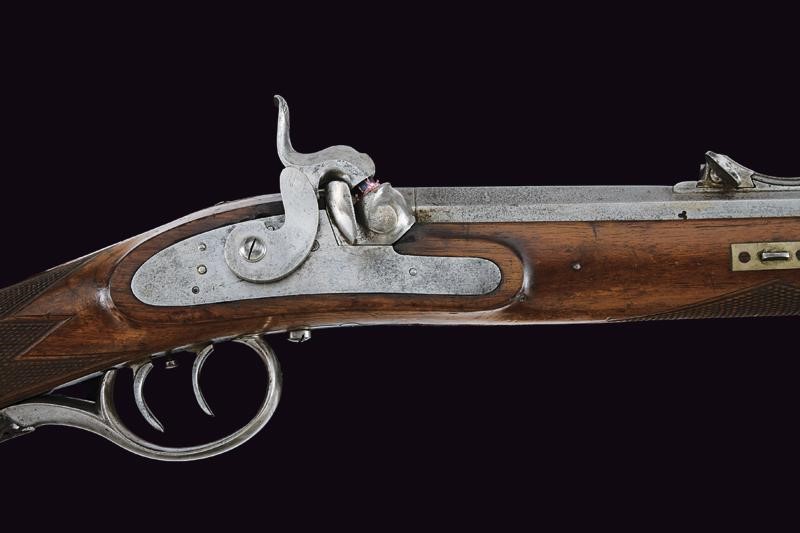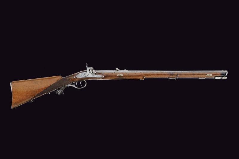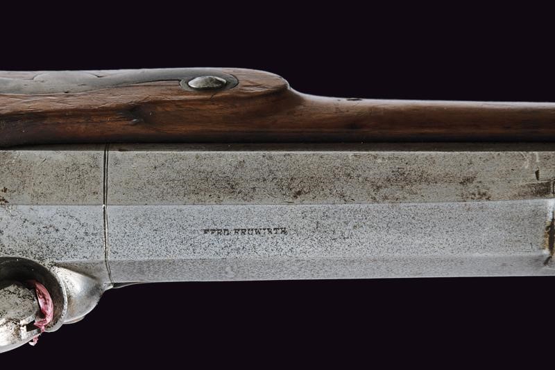 Octagonal, rifled, 13 mm cal. barrel (clean bore, clearly visible rifling), the base signed "FERD. FRUWIRTH", clover-shaped mark on the right side with adjustable breech and foresight; forward spring lock with flat lock plate, wooden full stock with checkered palm rest and base, iron mounts, the tang of the trigger-guard with dragon's head in the round. Set trigger. Partially brass-tipped iron ramrod. Working mechanism.