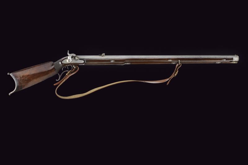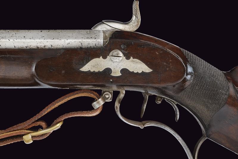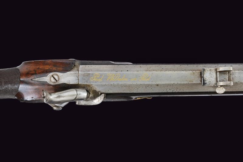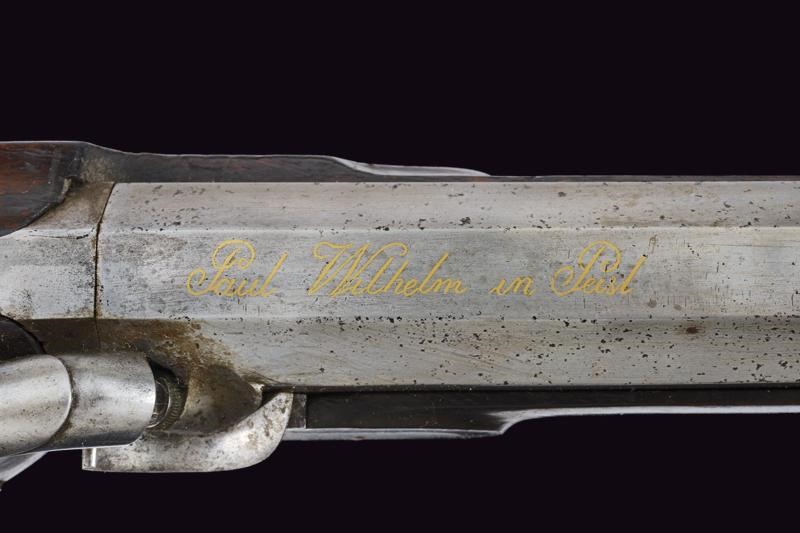 Heavy, octagonal, 50 cal. barrel, with fine, clearly visible rifling and clean bore, the base signed in gold "Paul Wilhelm in Peisl", adjustable rear sight and foresight, the nozzle with gold frame. Forward spring lock with flat lock plate. Wooden, full stock with iron mounts. Set trigger. Working mechanism. Brass-tipped wooden ramrod and iron cartridge extractor. Modern leather strap.