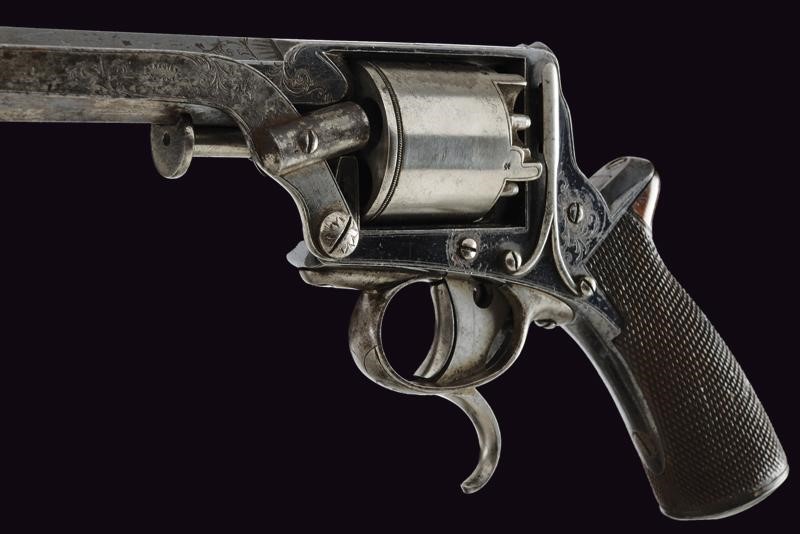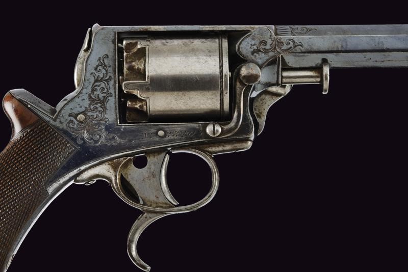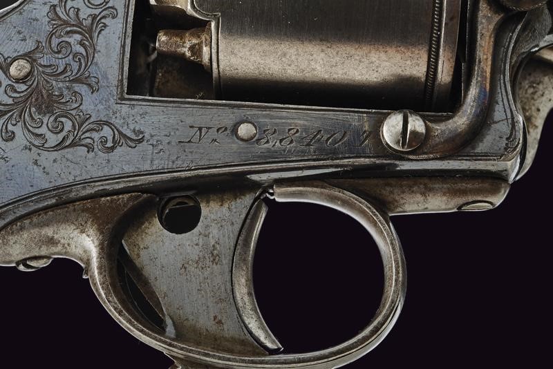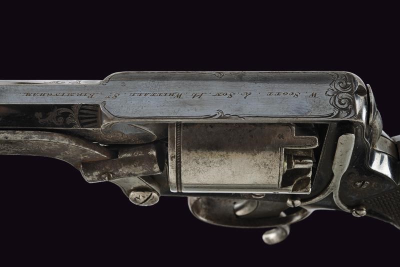 Rifled, octagonal, 11 mm cal. barrel (clean bore, visible rifling), with engraved base, with foresight; smooth, five-shot cylinder, with mark of the Birmingham test bench, engraved with one ring in the front. Frame marked "No. 8840T", "F.O" and engraved with floral motifs, the border outlined. Frame, grip-strap and barrel with 90% of the original bluing, frame marked "W. SCOTT & SON WHITTALL ST. BIRMINGHAM". Magazine and trigger marked "W. TRANTER'S PATENT". Checkered, wooden butt. Working mechanism.