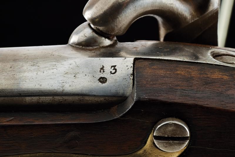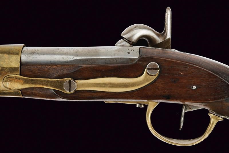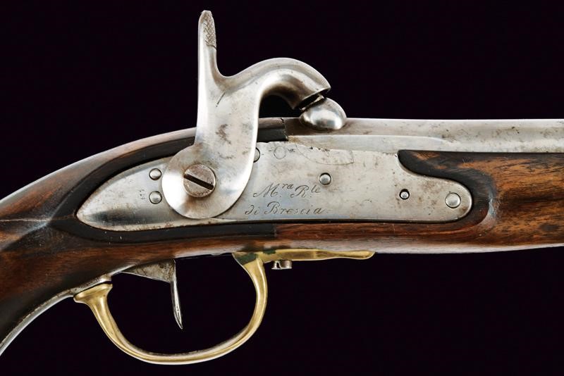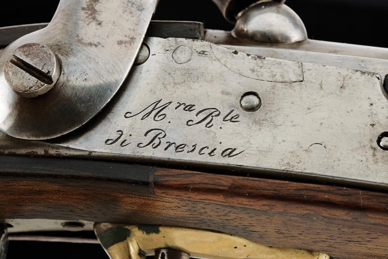 Smoothbore, round, 17,5 mm cal. barrel, with square base marked "43" and with mark; the back with iron mounts. Forward spring lock converted to percussion marked "M.ra R.le di Brescia". Wooden stock, the grip with cracks, brass mounts, iron ramrod and suspension ring.