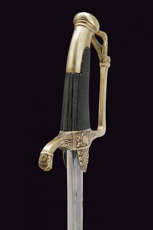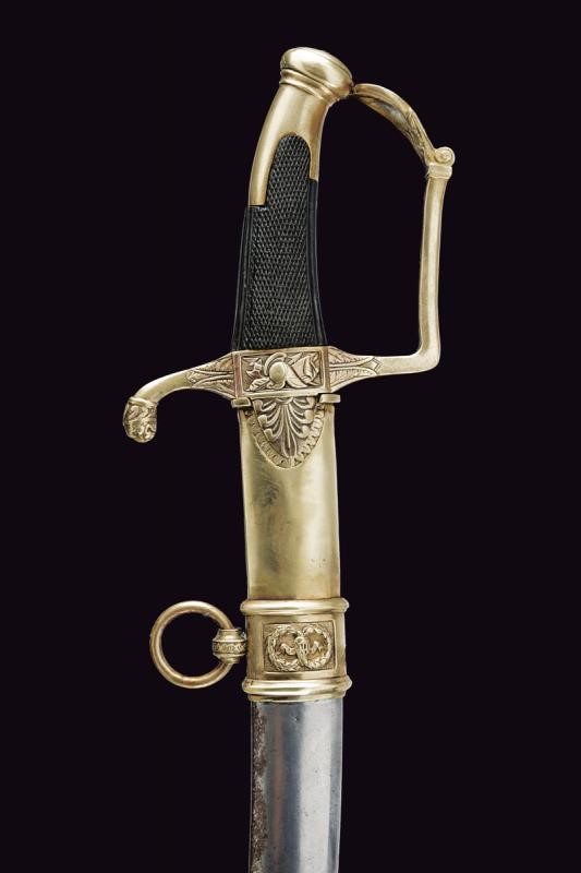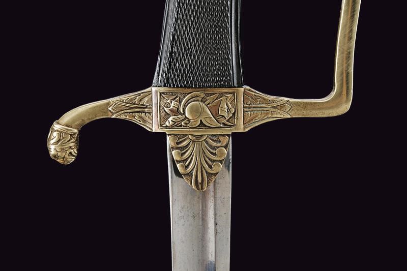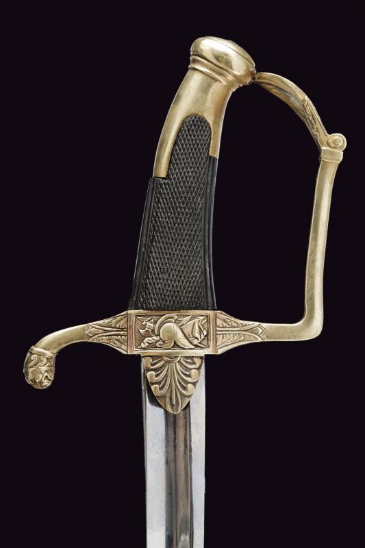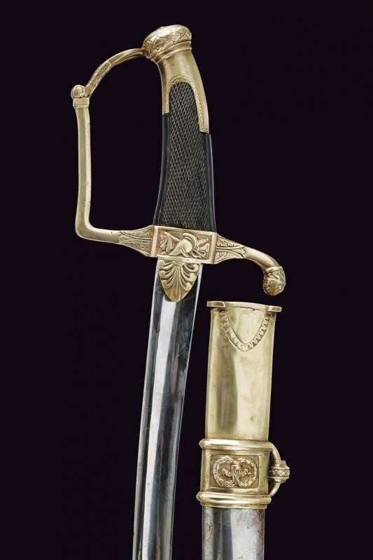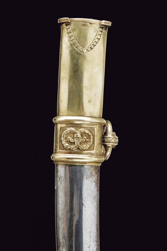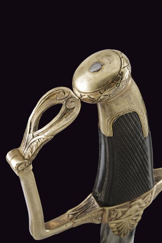 Curved, single-and-false-edged blade with wide central fuller. Brass hilt with remains of gilding, langets engraved with palmette, center of crossguard with trophy, quillon ending with a lion's head, angled loop-guard with hole at the top. Oval pommel engraved with laurel branches, short cap. Checkered ebony grip. Iron scabbard with brass mounts with two suspension rings on wide bands decorated with laurel wreaths. Long brass chape.