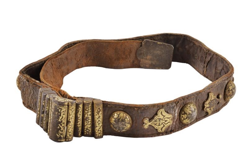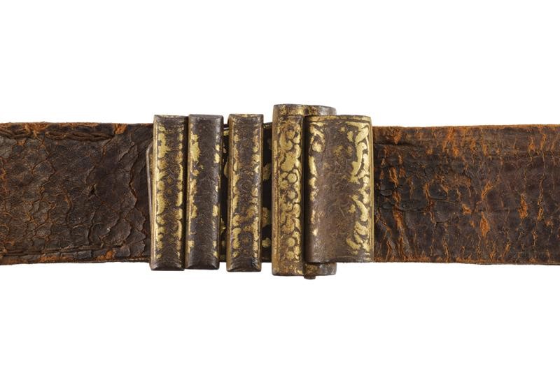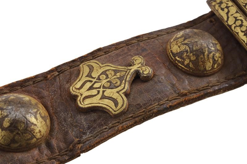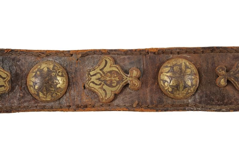 Made of leather (signs of use and time) with iron mounts decorated with gold floral motifs (missing parts). Complete with buckle and loops.
