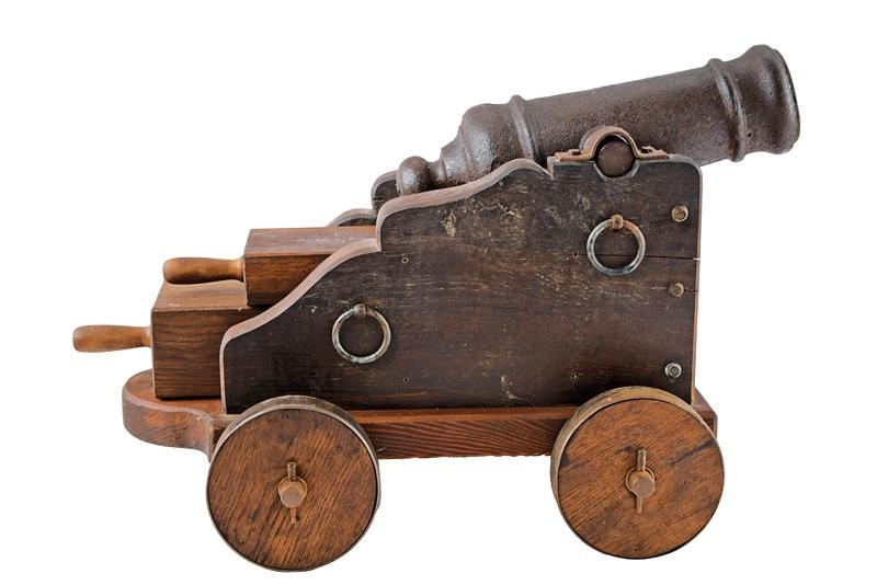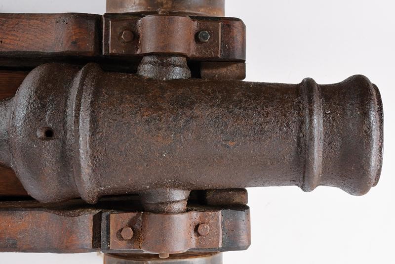 Small, iron barrel shaped as a truncated cone with small moulded nozzle and rings, provided with cylindrical trunnions and without handles, on the back the vent, on the bottom the cascabel knot. Mounted on a wooden shaft (later), type for naval use, with iron mounts and wooden and iron wheels. Two wooden wedge risers inside.