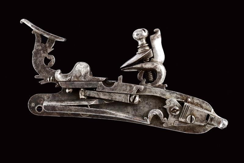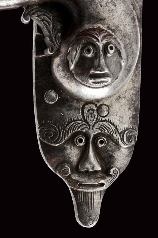 Slightly rounded plate, engraved with a flower at the centre, tang with fine mask. Cock with leaf-shaped curls, screw covering with carved mask. Carved batterie, sliding pan cover.